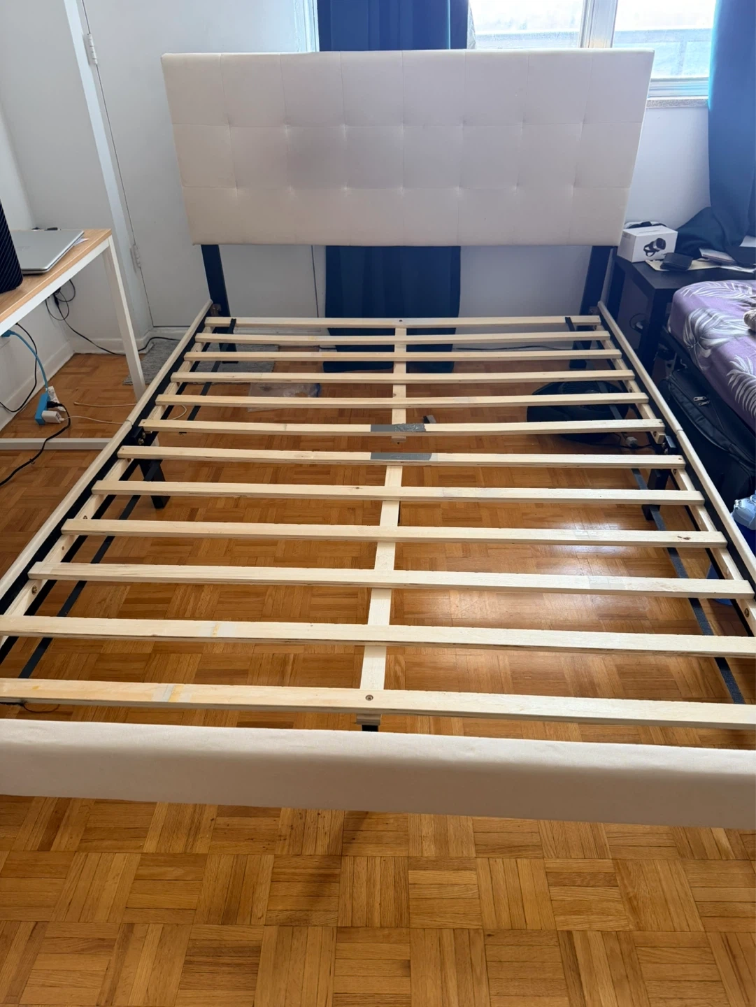 This upholstered bed frame features a tufted headboard in a neutral cream colour. It's a sturdy platform bed with supportive wooden slats, so no box spring is needed. The frame is designed for a queen-sized mattress.