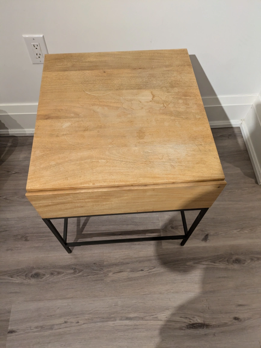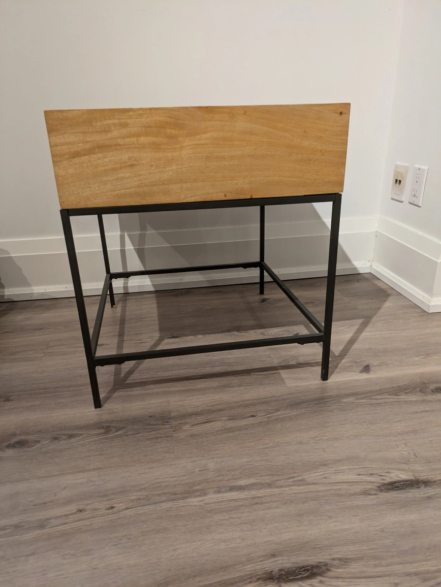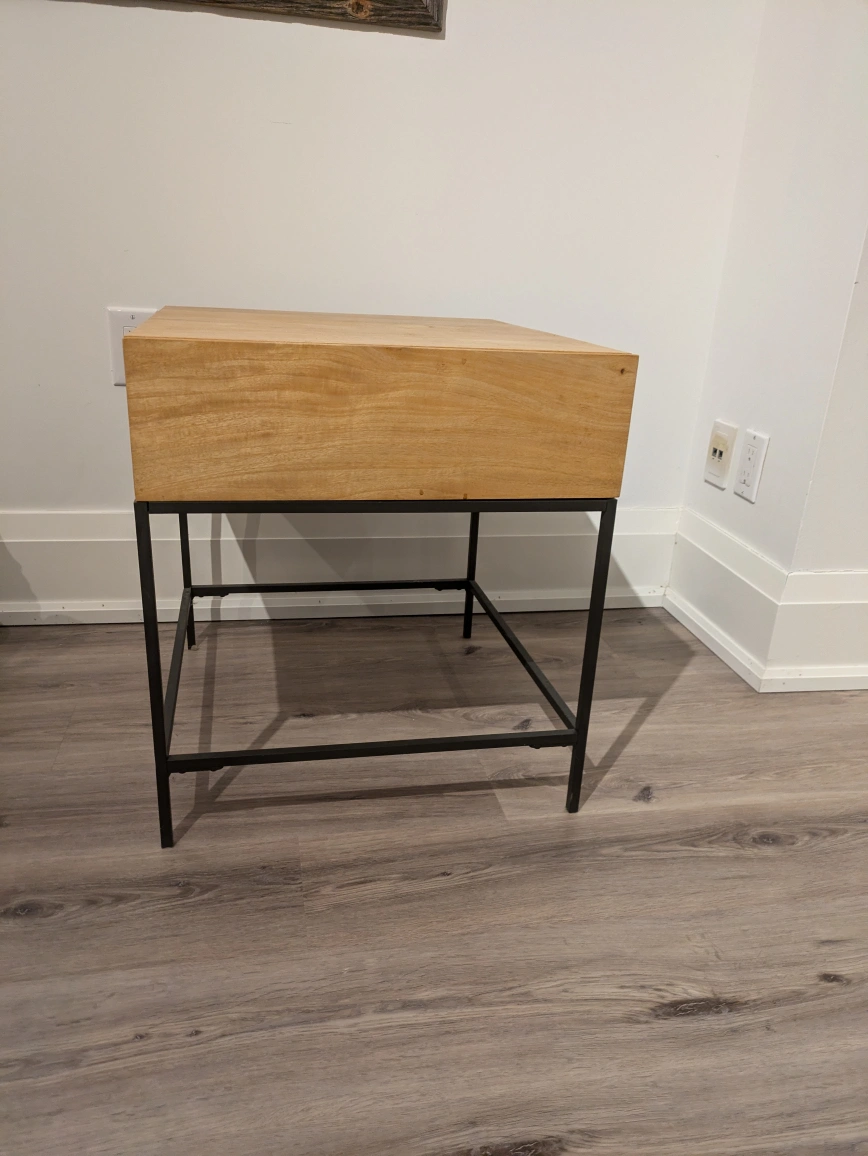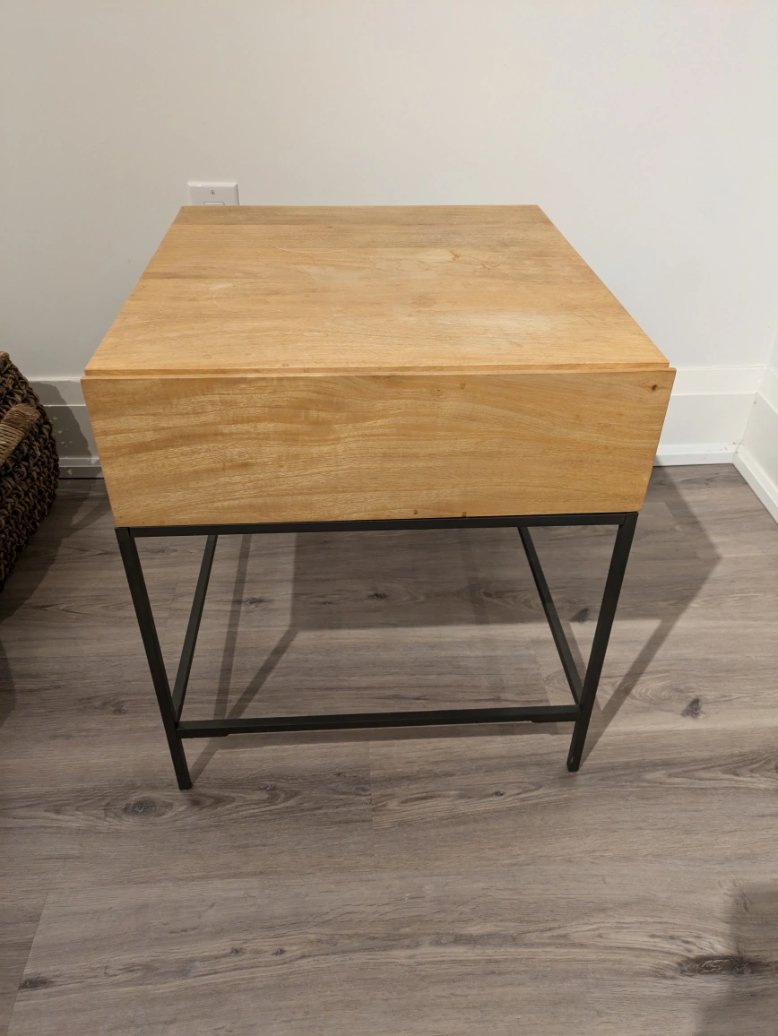 36West Elm Industrial Storage side table with a raw mango top and black metal legs. One drawer for storage. It is in good condition..No dents or scratches. Has just a few water stains on the top Originally sells for $524 plus tax My price is $55 Stylish and versatile piece. Quality made.