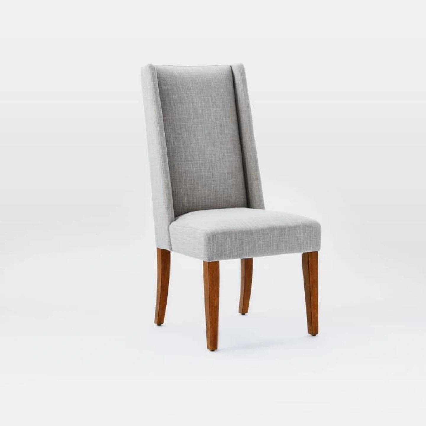 4 west elm high back dining chairs in light grey (salt & pepper) with real wood legs. All wrapped up and ready to go. ‘Moving sale + unfortunately don’t have space in the pod to take them’ They are in decent condition. A couple marks on one of the legs of the 1 chair. Pick up only. $100 for all 4. Price is negotiable.