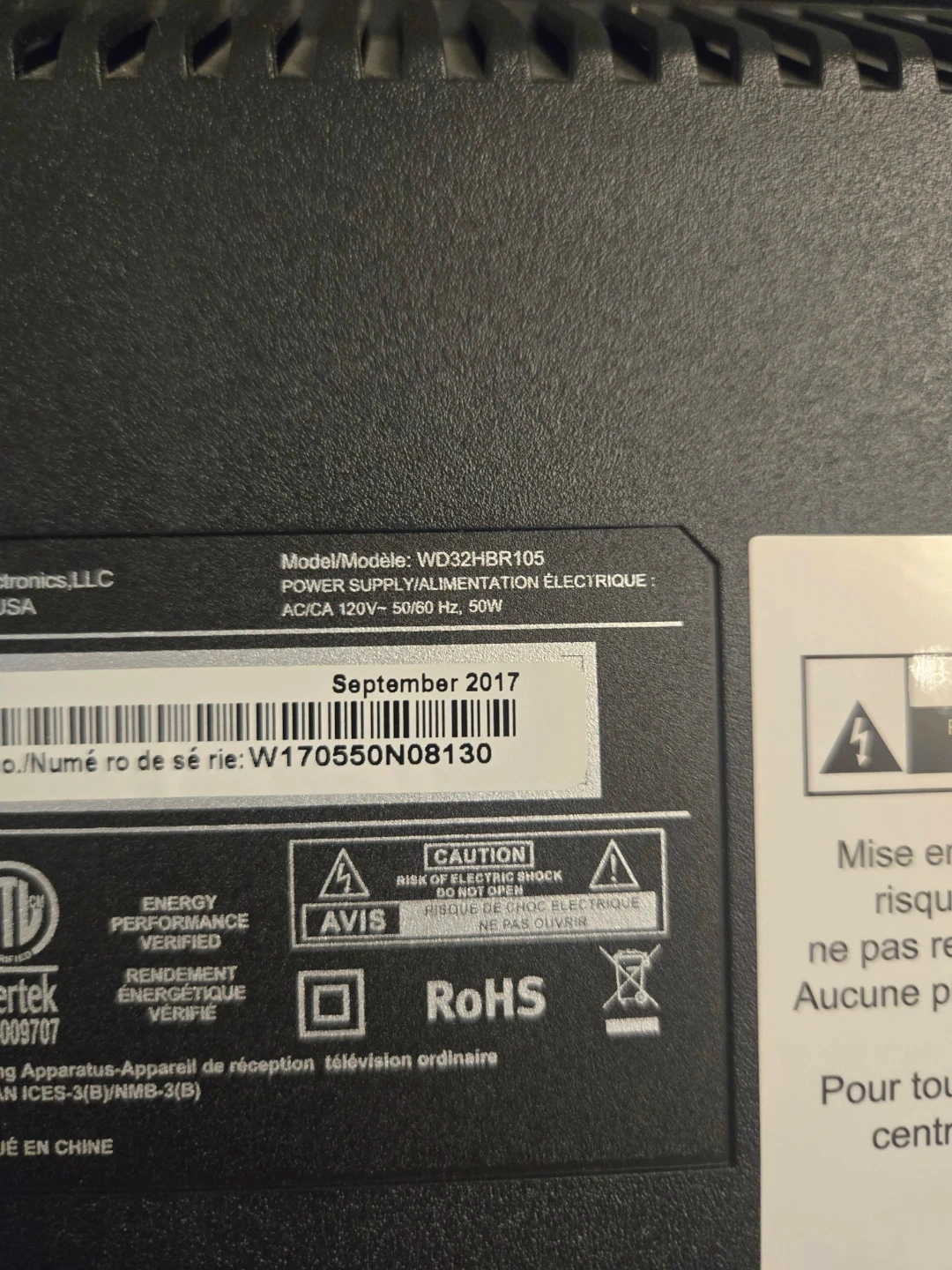 124Selling a Westinghouse 32-inch TV. The tv doesn't have a remote control. The model number is WD32HBR105. It was manufactured in September 2017. Perfect for a smaller space or as a secondary screen!