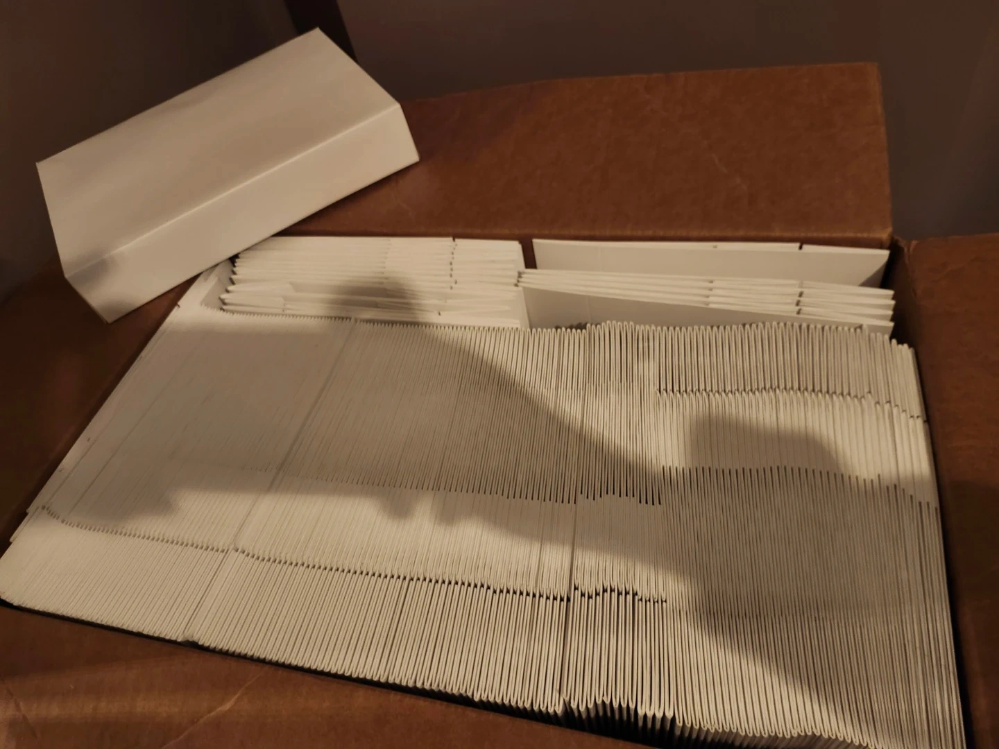 Selling a bulk of 168 white gift boxes. These boxes are perfect for wrapping presents or small items. Each box measures approximately 12 inches long, 8 inches wide, and 2 1/4 inches tall.