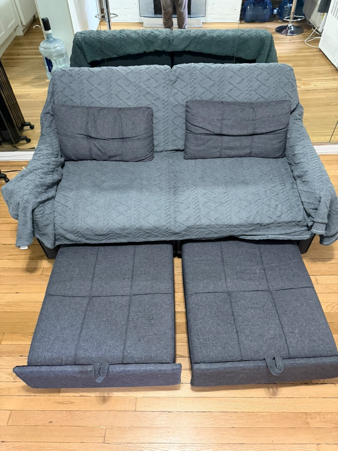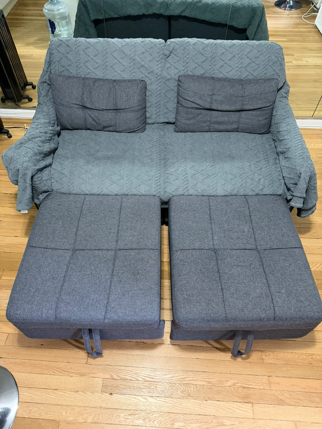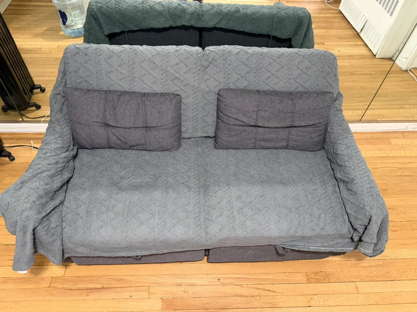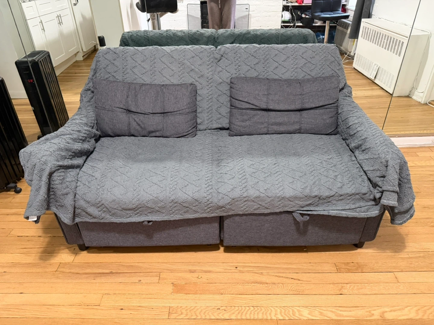 This grey loveseat sofa offers a comfortable seating option. It includes two matching throw pillows and it fully reclines, comfortable for sleeping. Always had a cover on. Upholstered in a durable fabric.