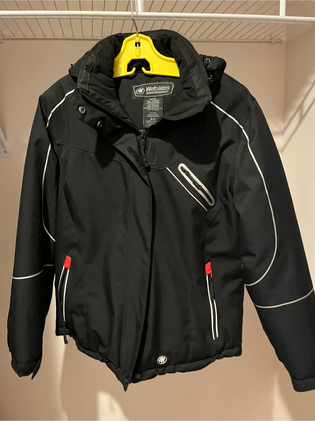 10Brand New winter ski jacket with hood and lots of pockets. Women’s Small. Cozy fleece lining - very warm. Bottom has adjustable inner panel on bottom. Lots of pockets Adjustable cuffs. Pickup only. DM for video with close details.