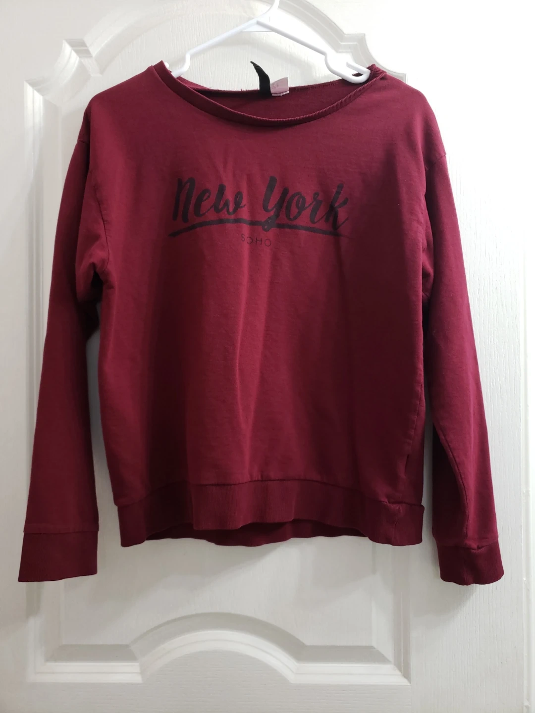 Burgundy crewneck sweatshirt with 'New York Soho' graphic. It's a size medium, made in Bangladesh. This comfy sweatshirt is great for casual wear.