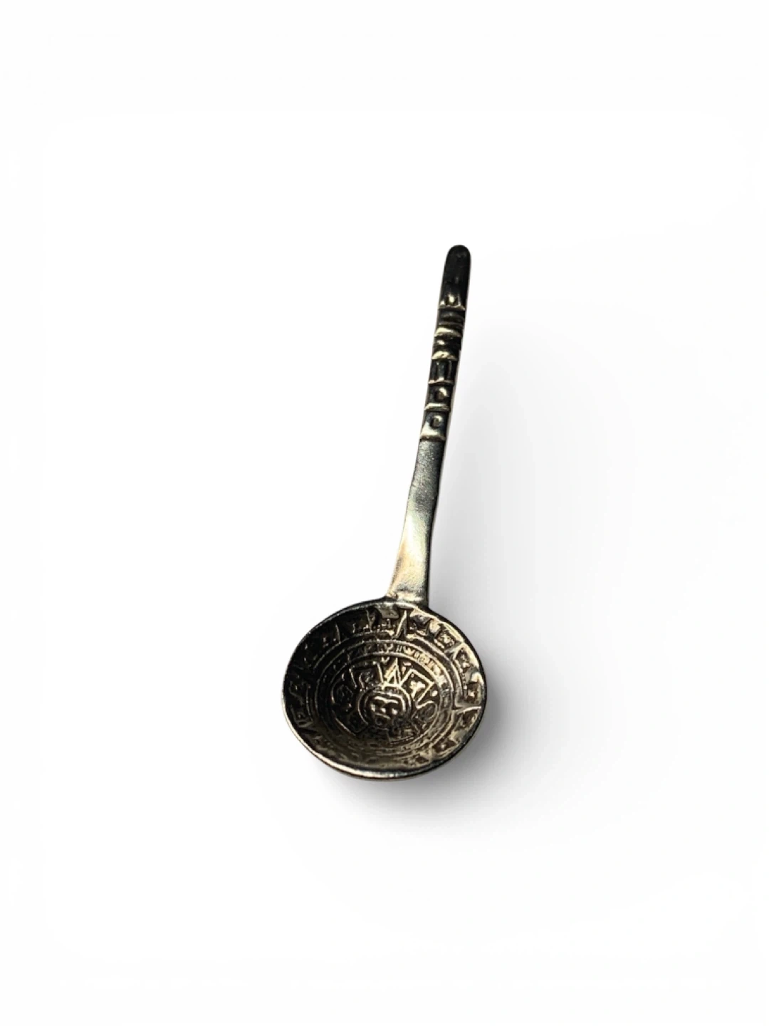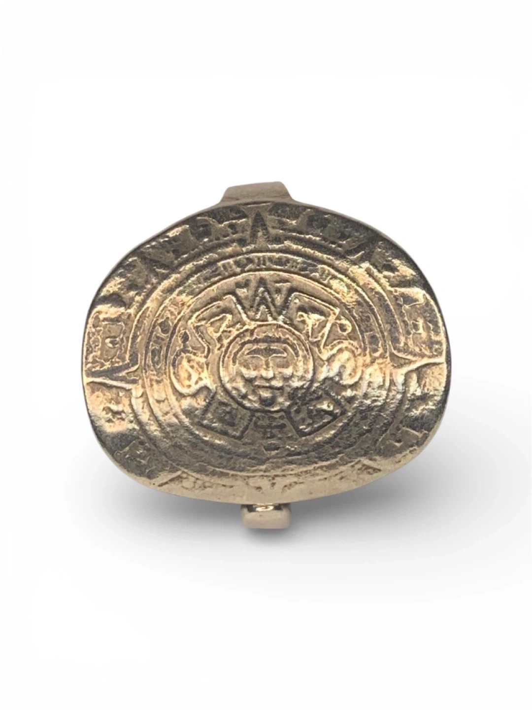 Sterling silver ring featuring an intricate Aztec Sun Stone design. Stamped 'MEXICO 925'. It's a unique piece with a rich cultural motif.