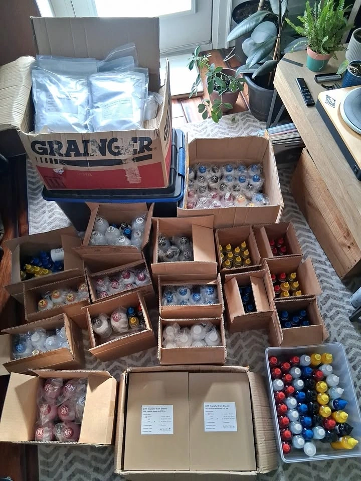 Inventory from DTF Co. of ink, transfer paper and powder. Bottles in 100ml, 250ml, 500ml, and 1L (white only) sizes. C M Y K Wh. Powder is in 1kg bags. Black and White powder. Transfer paper comes in A4 (210x297 mm / 8.3x11.7 in), A3 (297x420 mm / 11.7x16.5 in), and Super B (330x483mm / 13x19 in). Ink is past best before date. I can provide samples if you want to test it out. Make an offer for the entire lot. Willing to drop off for free if you buy the entire lot, but a downpayment is required. Also have Sublimation Co. ink if interested.