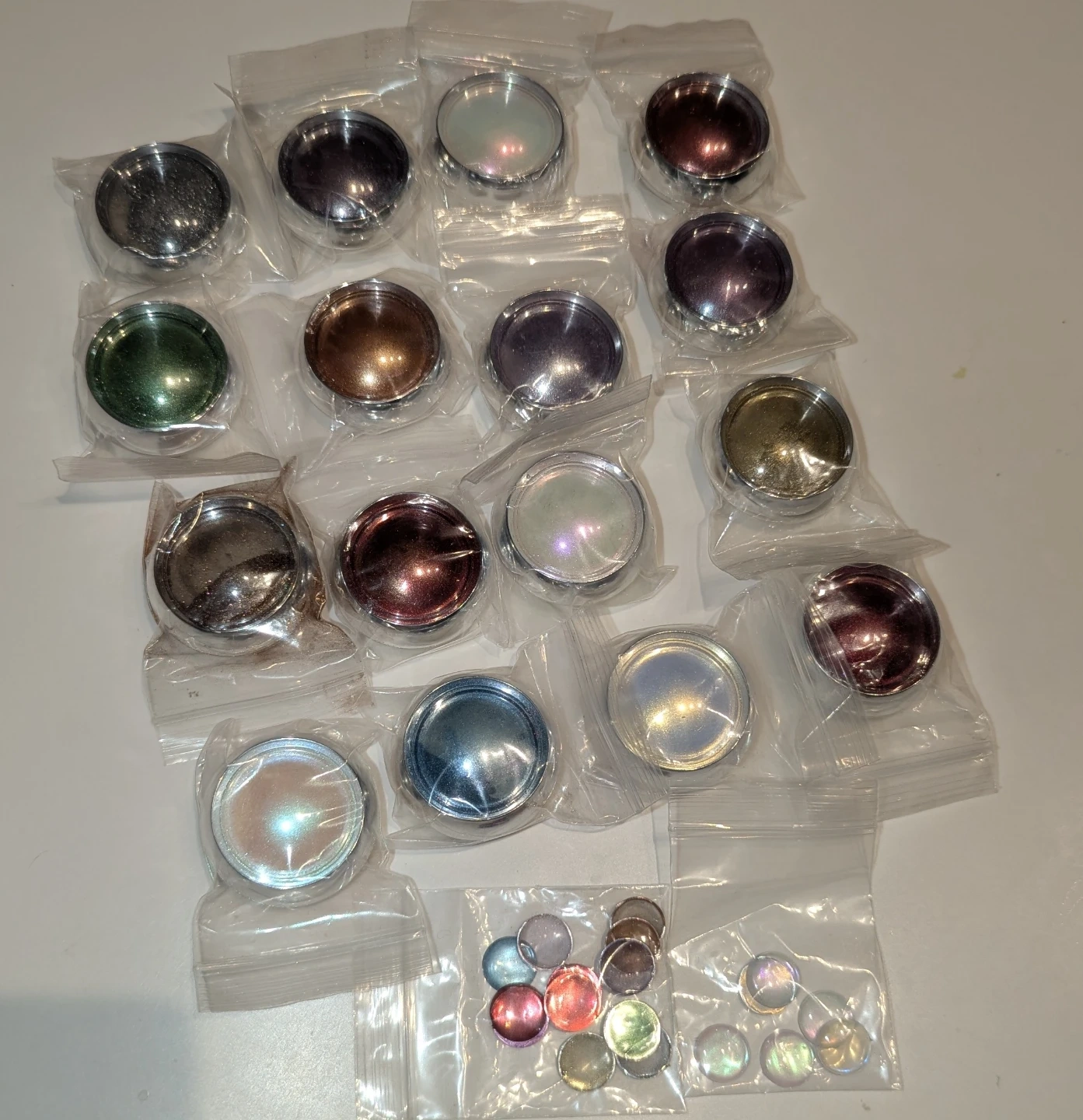 This kit includes a variety of nail art pigments, three bottles of Beetles gel top coat, and other accessories for creating unique nail designs. The pigments come in small containers and offer a range of colours with shimmery finishes.