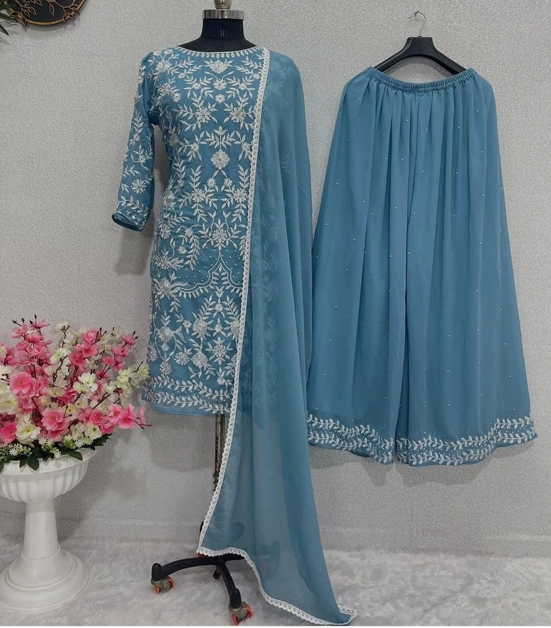 Beautiful blue three-piece outfit with intricate white embroidery. It's made from a lightweight fabric and includes a matching dupatta. This ensemble's design makes it suitable for festive occasions.
