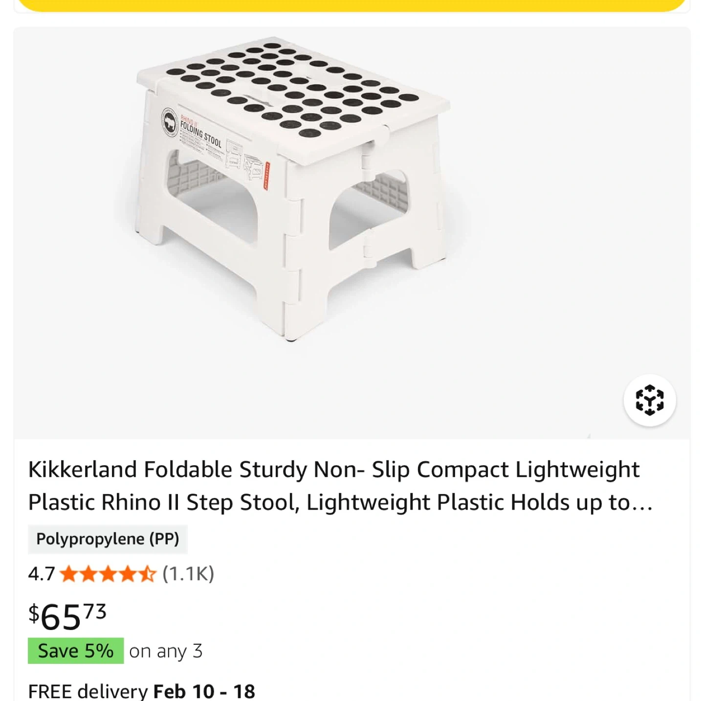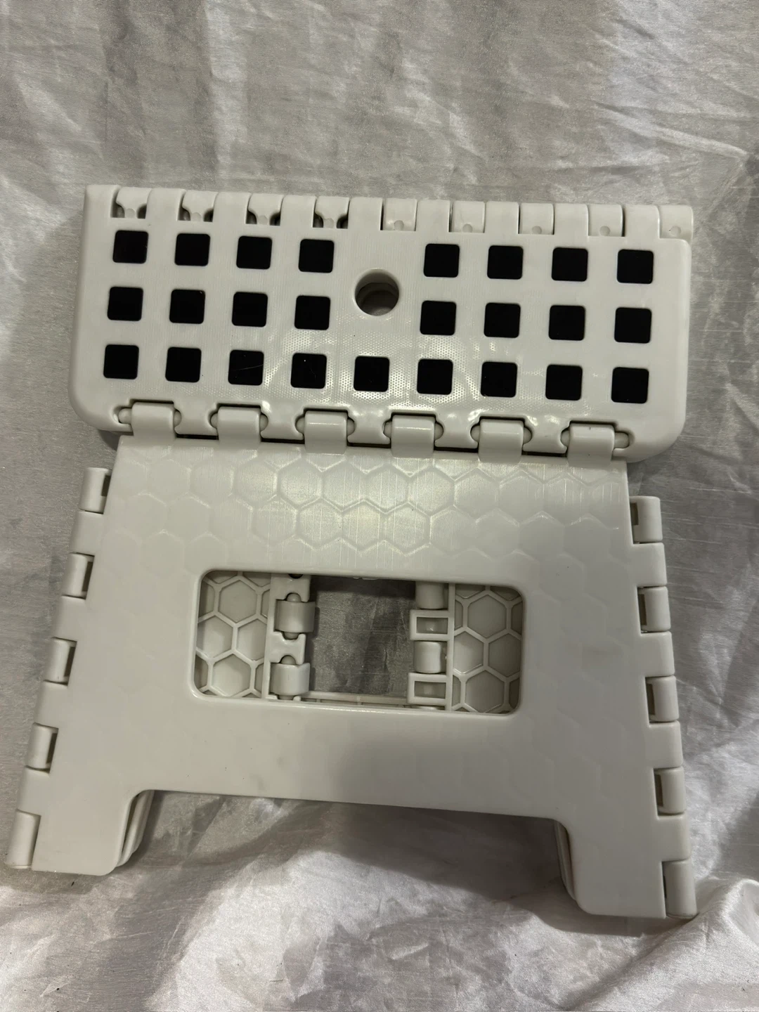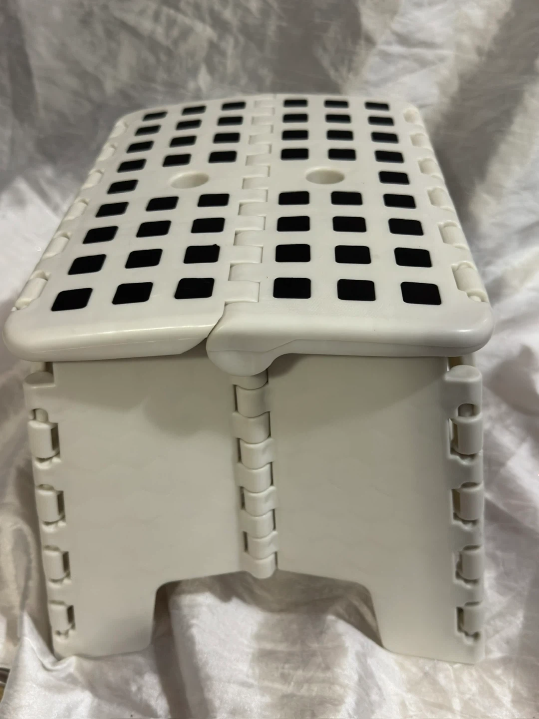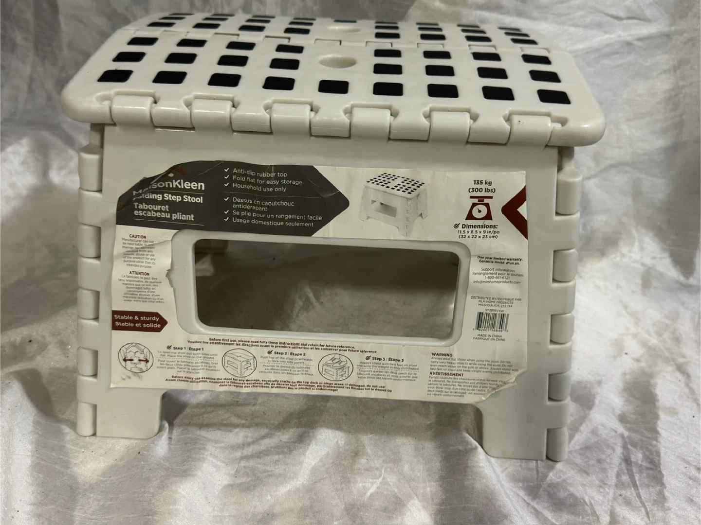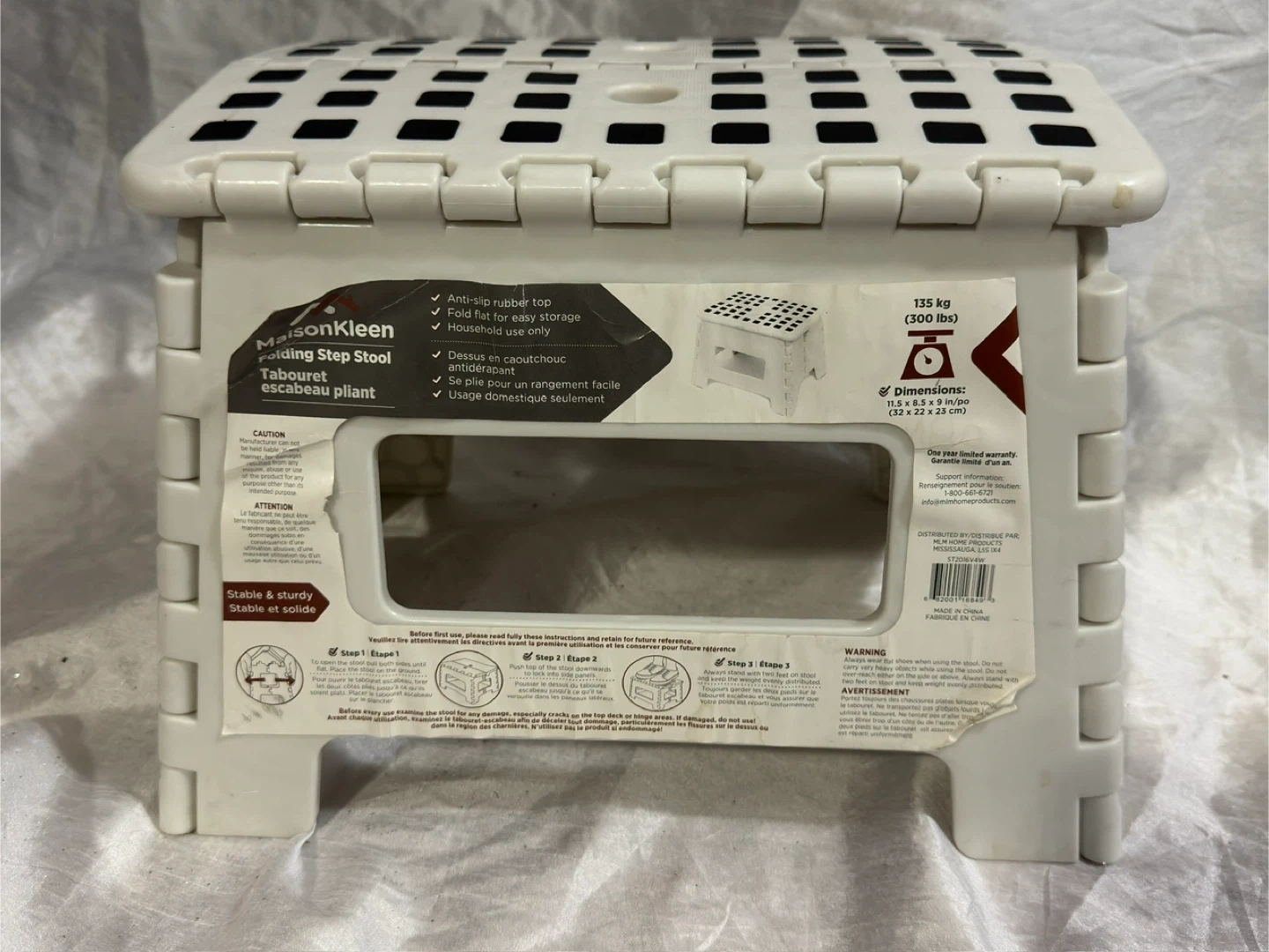This MaisonKleen step stool is white and made of plastic. It's foldable for easy storage and features an anti-slip rubber top. It can hold up to 135 kg (300 lbs).