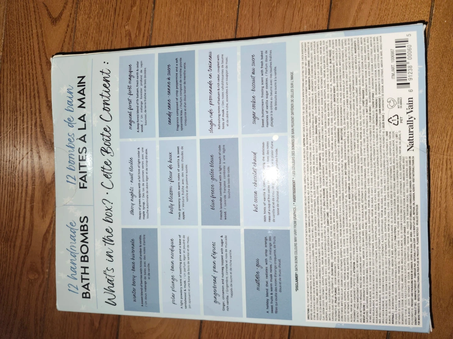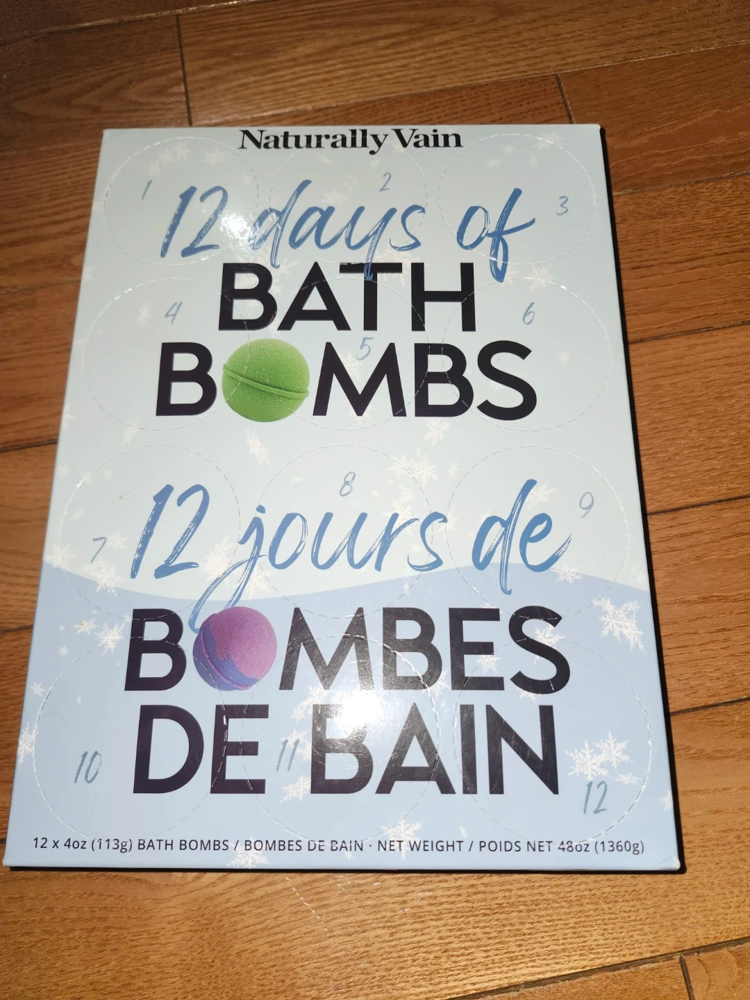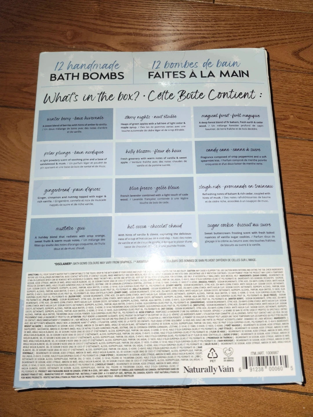 Includes 12 handmade bath bombs with various scents like winter berry, polar plunge, and gingerbread. Each bath bomb is 4oz (113g). Net weight 48oz (1360g).