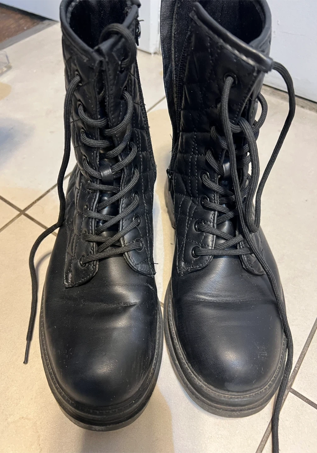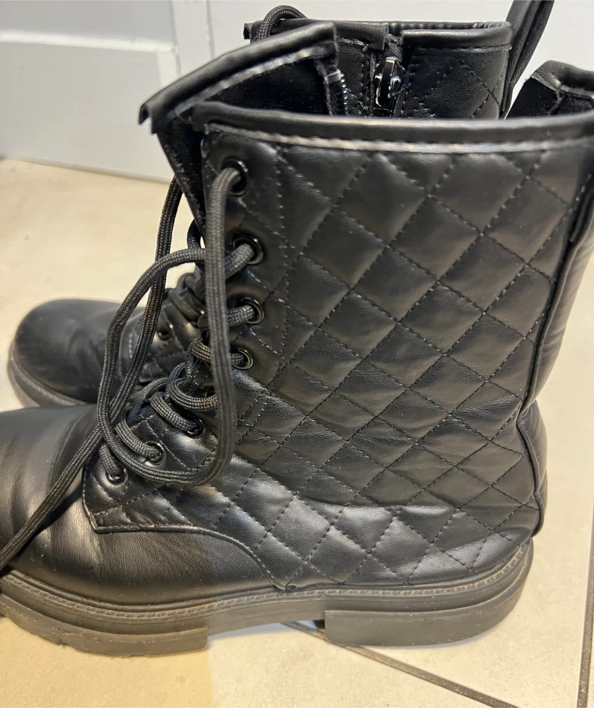 Black combat boots with a quilted pattern. They feature laces and a side zipper for easy on and off. Material appears to be faux leather. Size is 8.