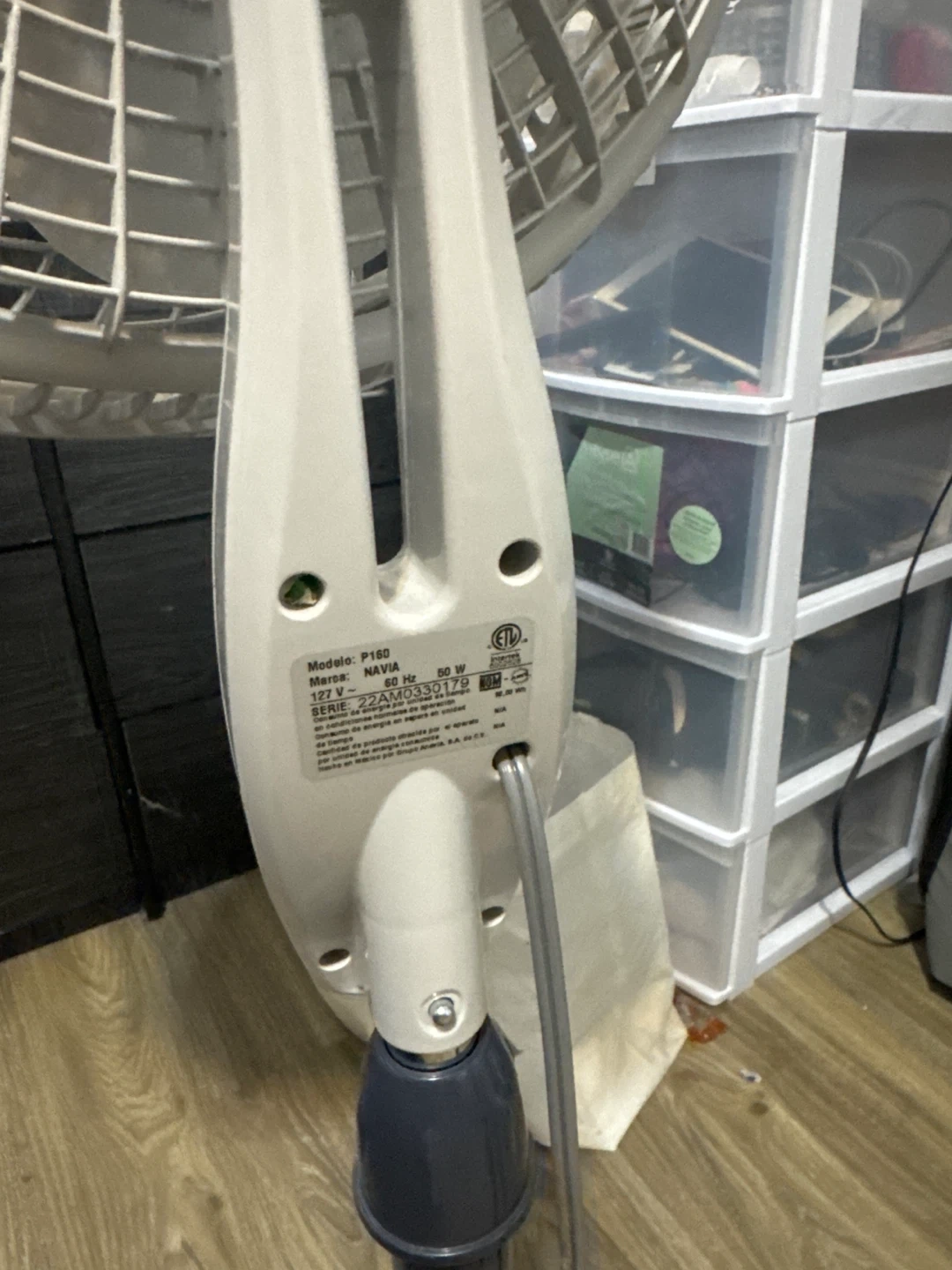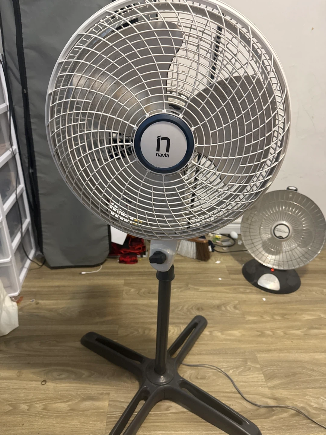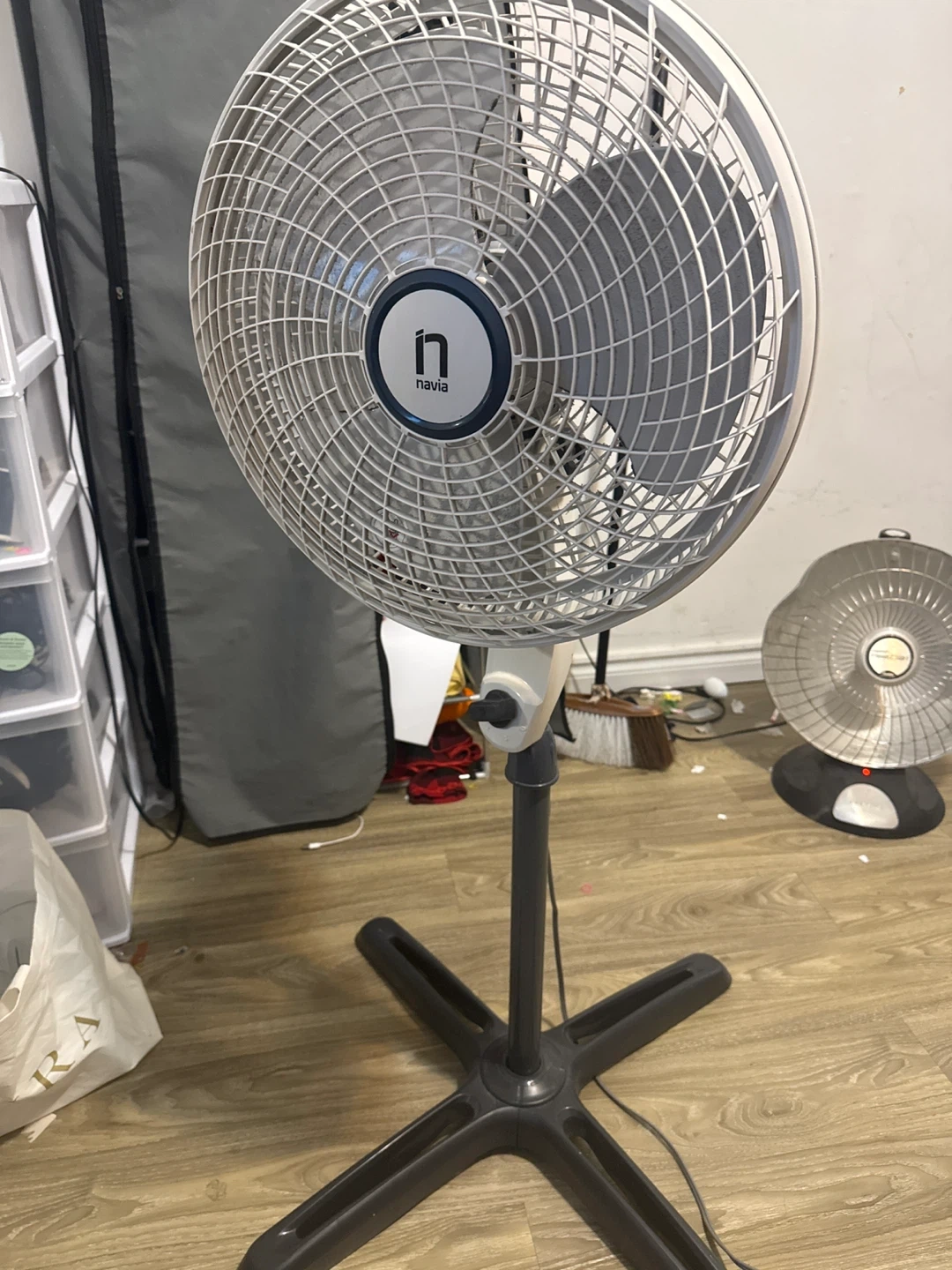 Navia pedestal fan, model P180. It's white and grey with three speeds and an adjustable height. Great for circulating air!