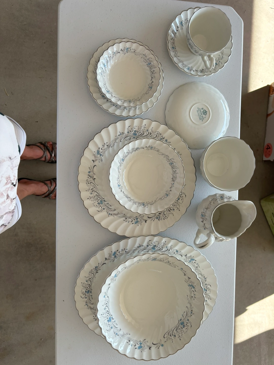 A set of vintage blue willow ironstone dinnerware. Service for 8, with additional cream, sugar, larger bowl and platter.