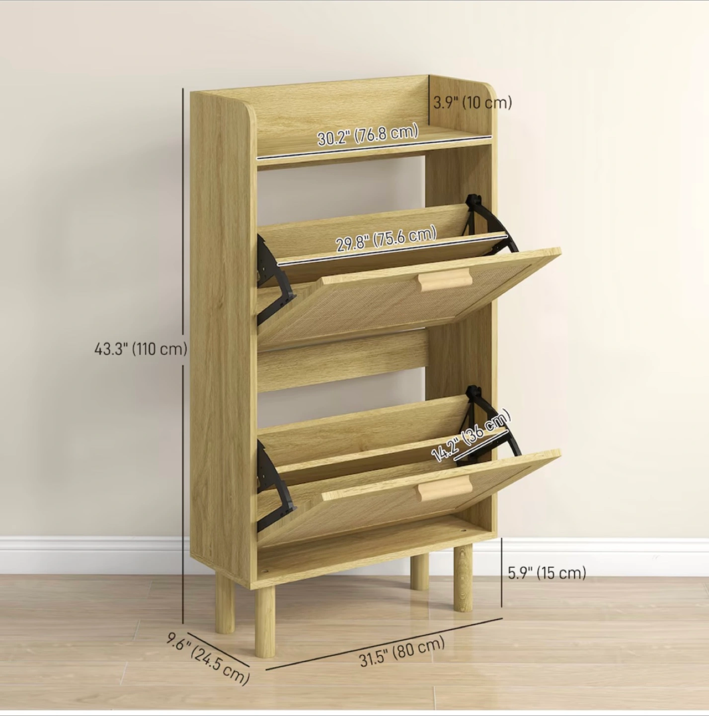 A wooden shoe cabinet. Featuring two compartments. Top shelf space, as well. Great for storing your shoes, and other items, at the end of a long day.
