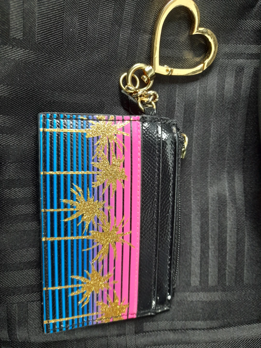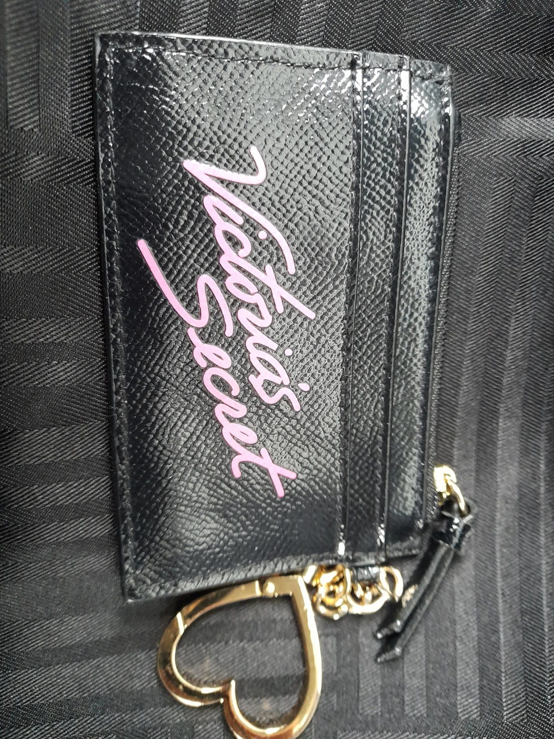 This Victoria's Secret card holder is black with a pink logo. It also features a vibrant striped design with palm trees on the reverse. It includes a gold-toned heart-shaped keychain clip. Perfect for keeping your cards handy!