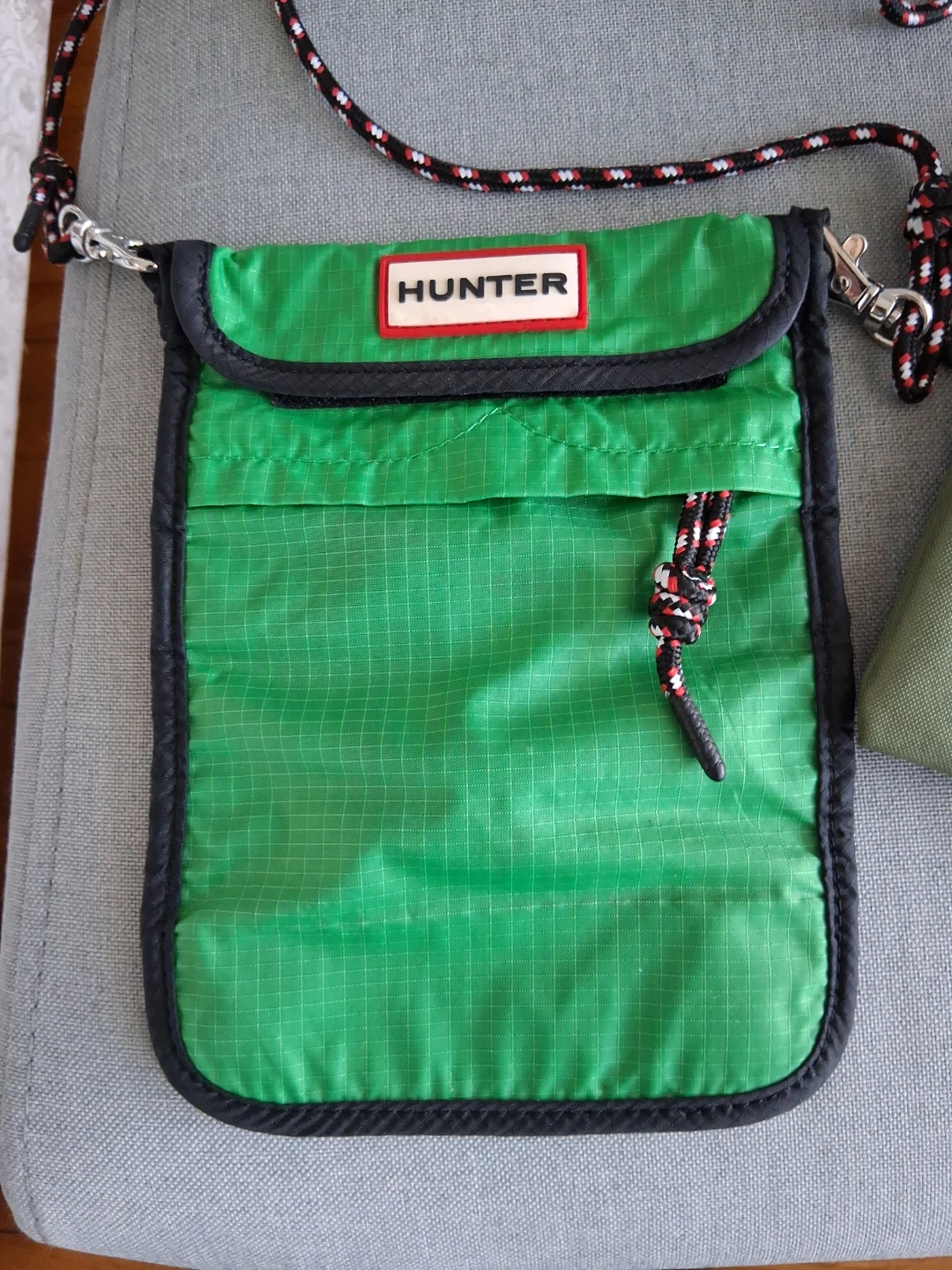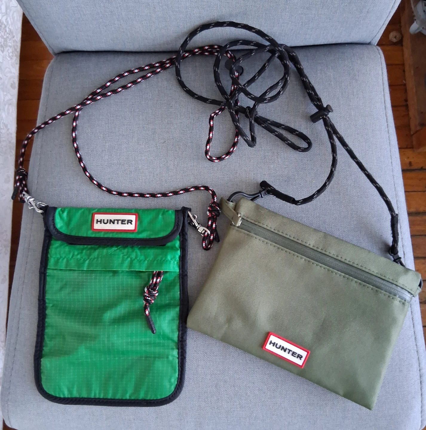 Hunter nylon crossbody pouches. One green and one khaki. Features adjustable straps for comfortable wear. Great for keeping essentials organized on the go!