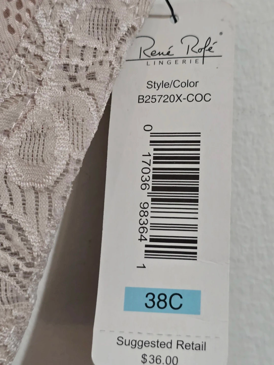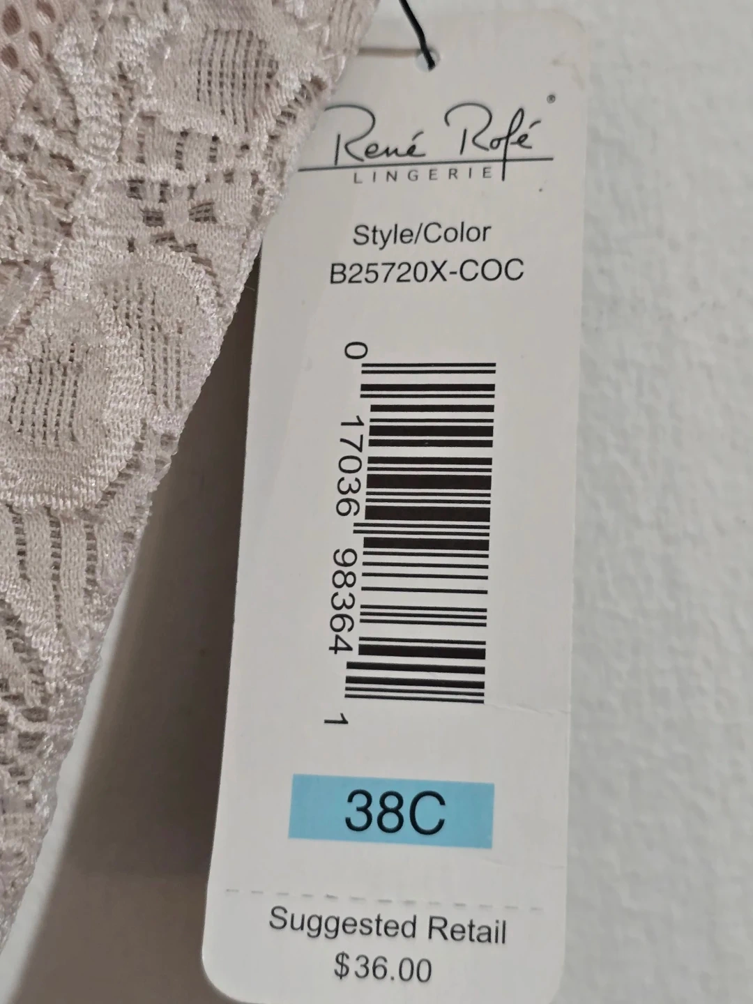 This Rene Rofe bra features a lightly padded design with intricate lace detailing. It's a size 38C with an adjustable strap for a comfortable fit. A beautiful addition to any lingerie collection!