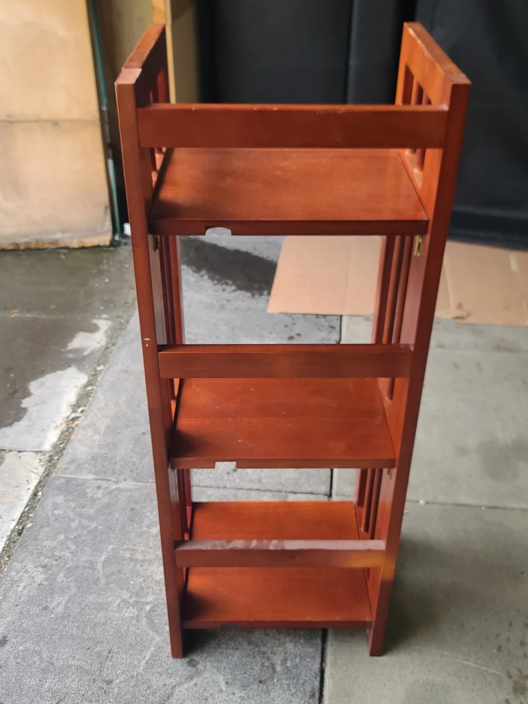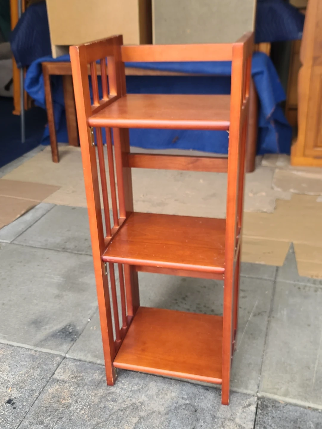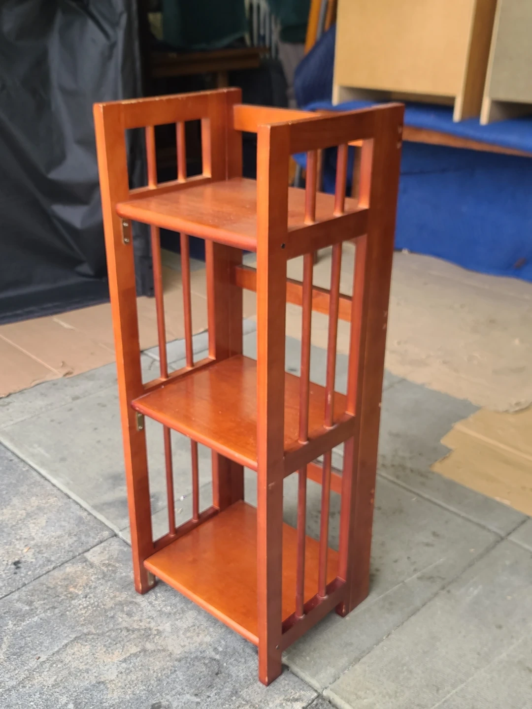 A compact 3-tier wooden bookshelf with a rich, warm finish. Perfect for displaying books or decorative items. Easy to set up and move! Measurements: W 14" X D 11" X 36". Viewing and pickup by appointment.