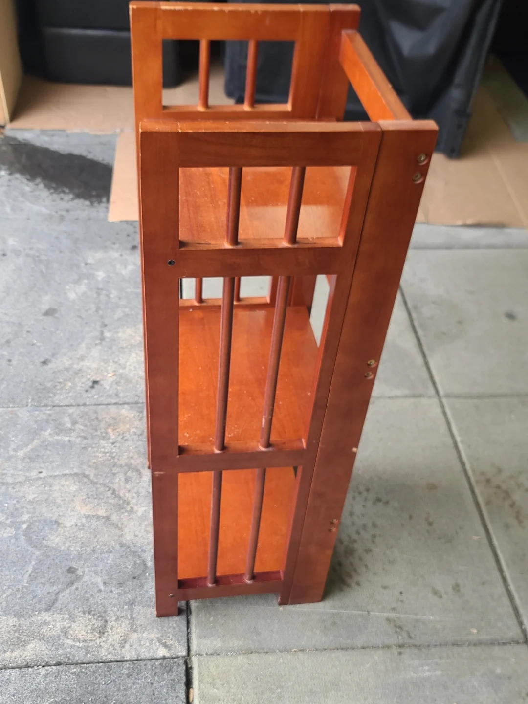 A compact 3-tier wooden bookshelf with a rich, warm finish. Perfect for displaying books or decorative items. Easy to set up and move! Measurements: W 14" X D 11" X 36". Viewing and pickup by appointment.