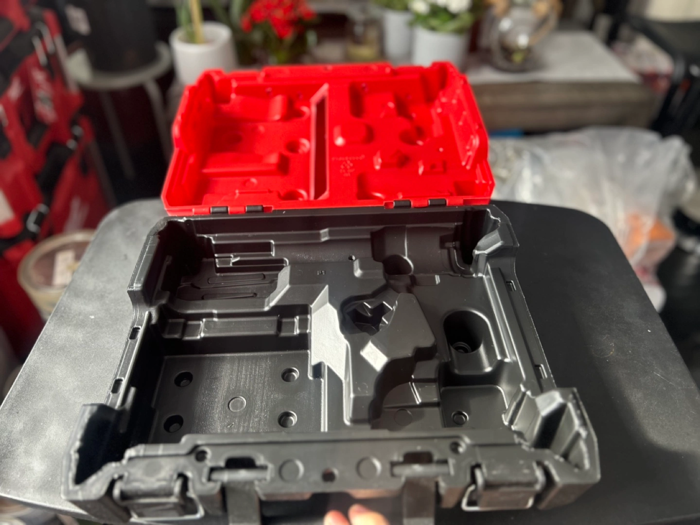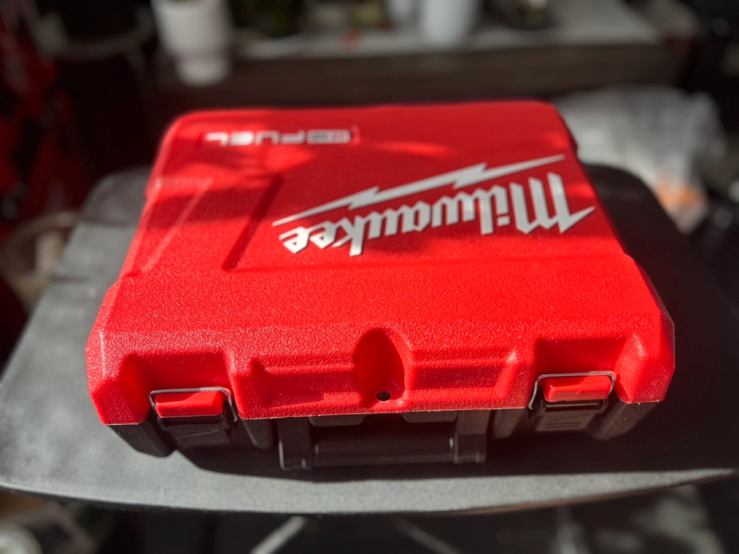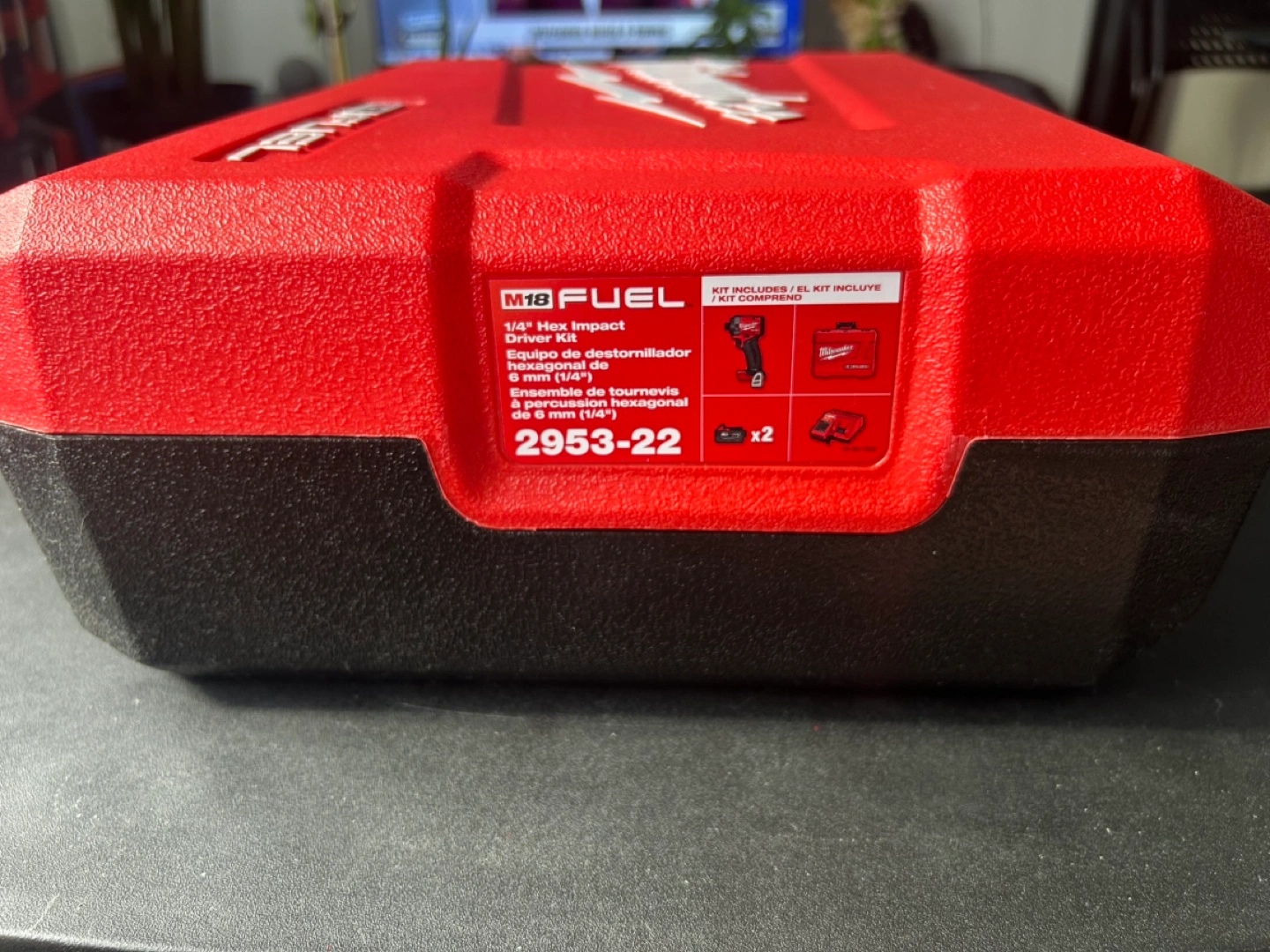 Empty hard carrying case for Milwaukee M18 FUEL 1/4" Hex Impact Driver kit. Model number 2953-22. Red plastic case with black interior.