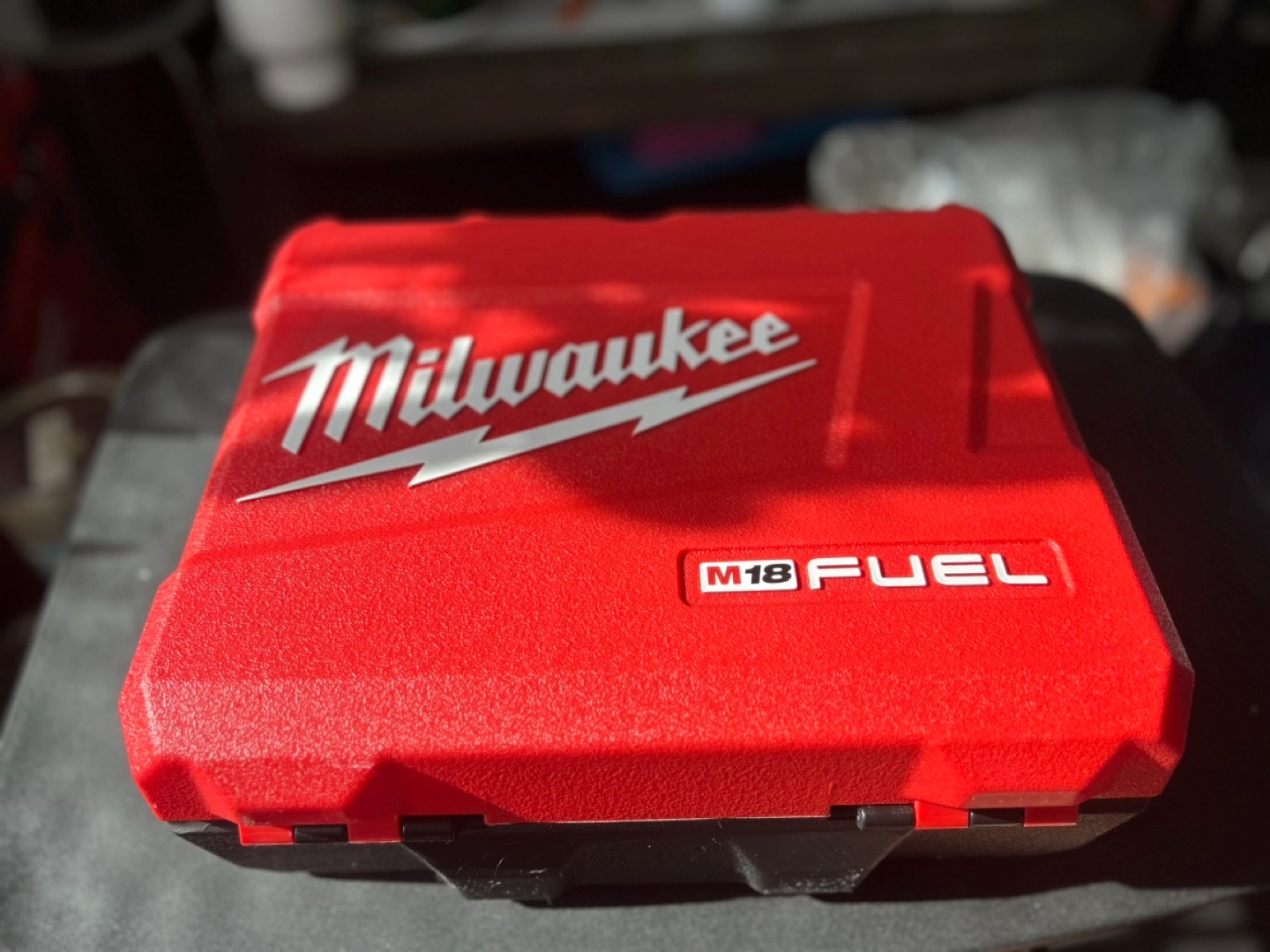 Empty hard carrying case for Milwaukee M18 FUEL 1/4" Hex Impact Driver kit. Model number 2953-22. Red plastic case with black interior.