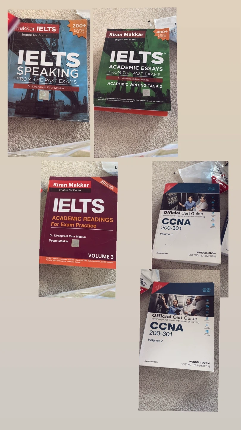 This lot includes Kiran Makkar IELTS Speaking, Academic Essays, and Academic Readings Volume 3 books. Also included are Wendell Odom's Official Cert Guides for CCNA 200-301 Volumes 1 and 2. These books are great for exam preparation.