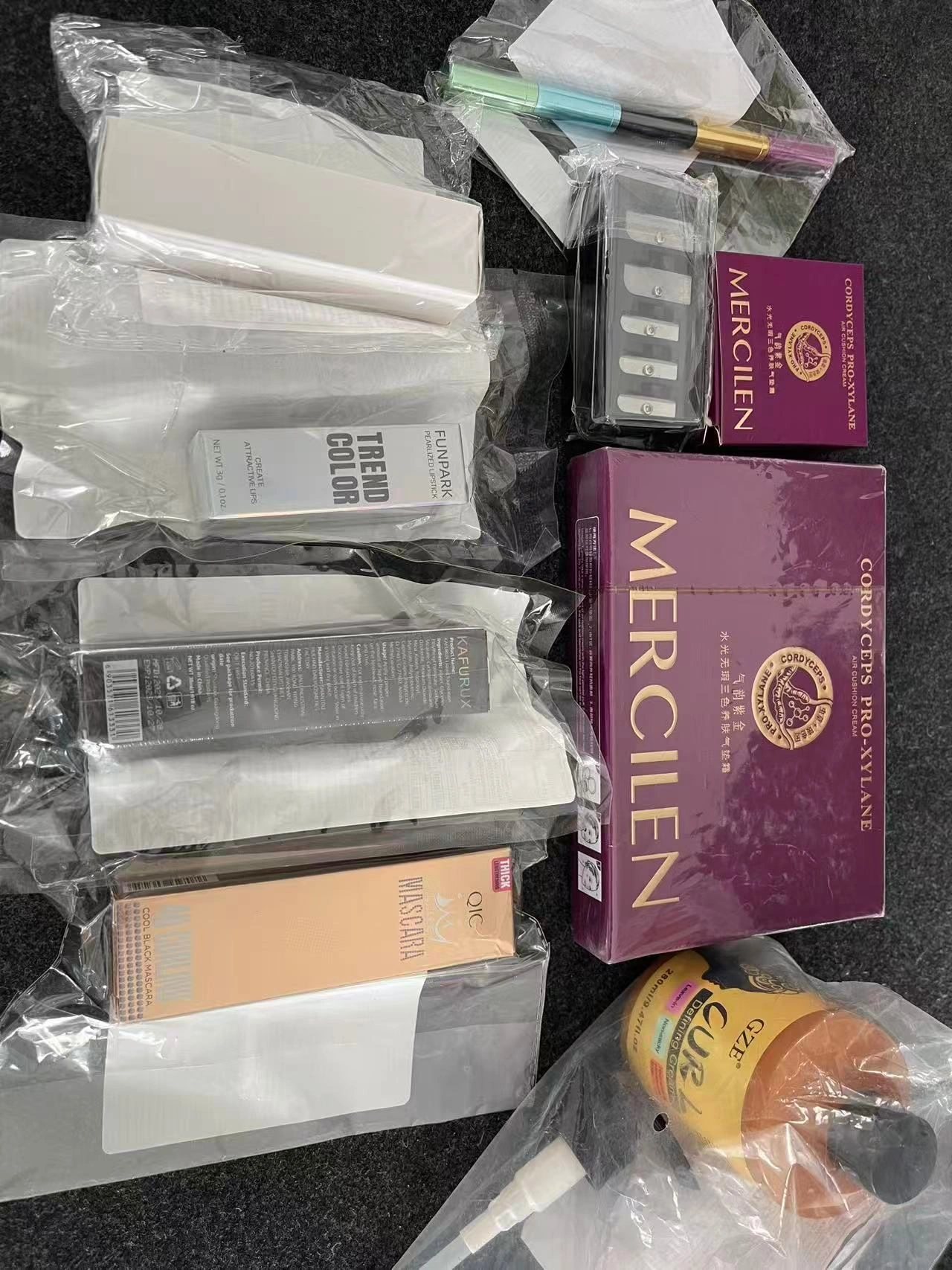 Includes mascara, cosmetic tools, nail supplies, and skincare items.