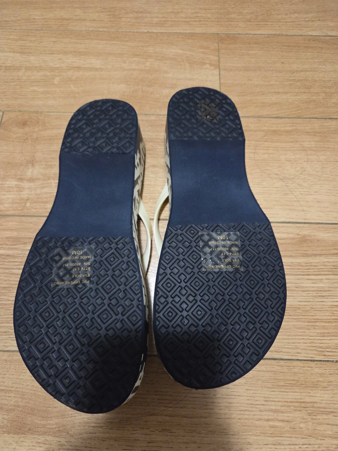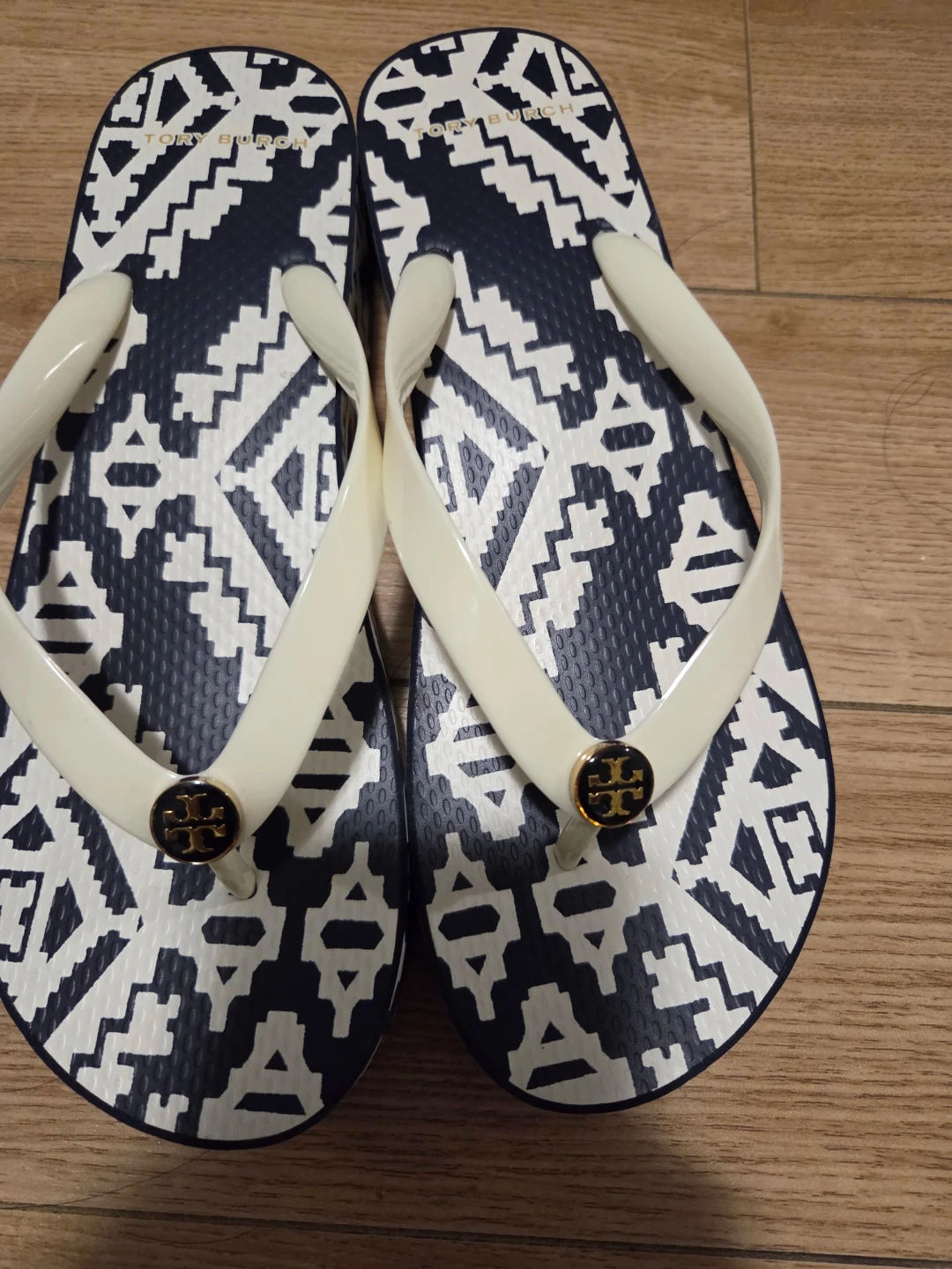 These are a pair of Tory Burch sandals in a size 10M. They feature a navy and white geometric pattern on the footbed and cream-colored straps. Perfect for summer!