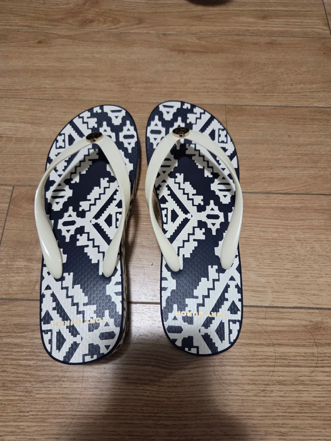 These are a pair of Tory Burch sandals in a size 10M. They feature a navy and white geometric pattern on the footbed and cream-colored straps. Perfect for summer!