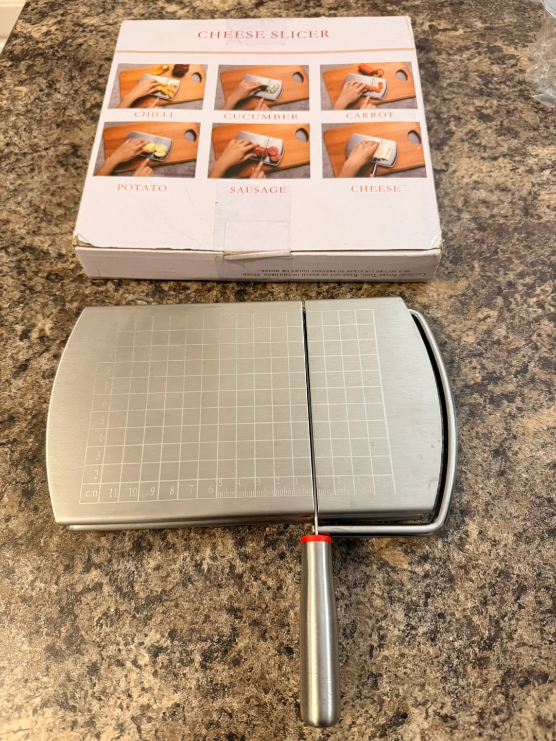This cheese slicer is made of durable stainless steel. It has a wire cutting blade and a handle for easy use. The base features grid markings for consistent slicing. It's great for slicing cheese, potatoes, and other firm foods!