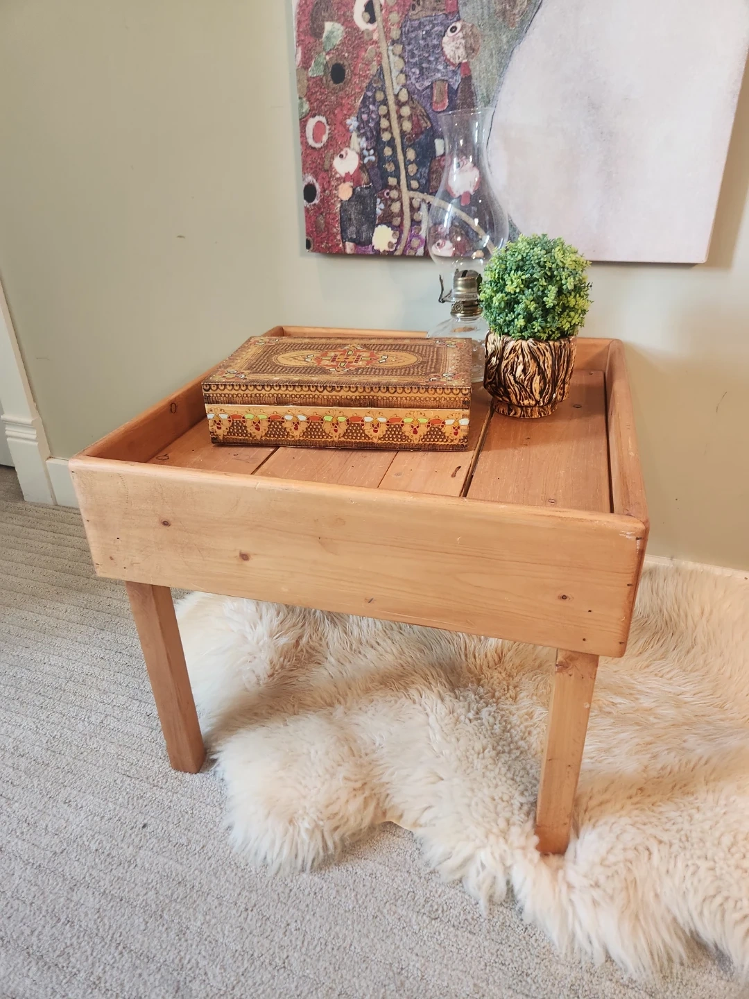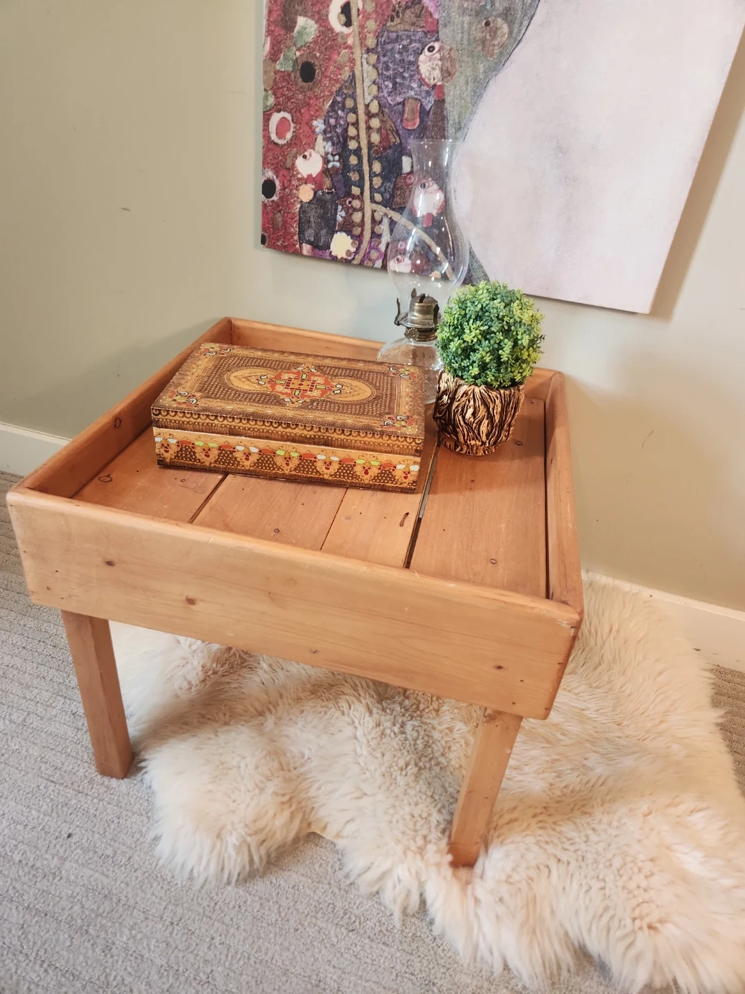 This wooden tray table is perfect for holding books, drinks, or decorative items. It's made of natural wood, its super sturdy and features a unique tray design. It would be a great addition to a living room or bedroom! Matches macreme, pottery, plants and cabin decor. Surface is 21x21 inches and 18 inches high.