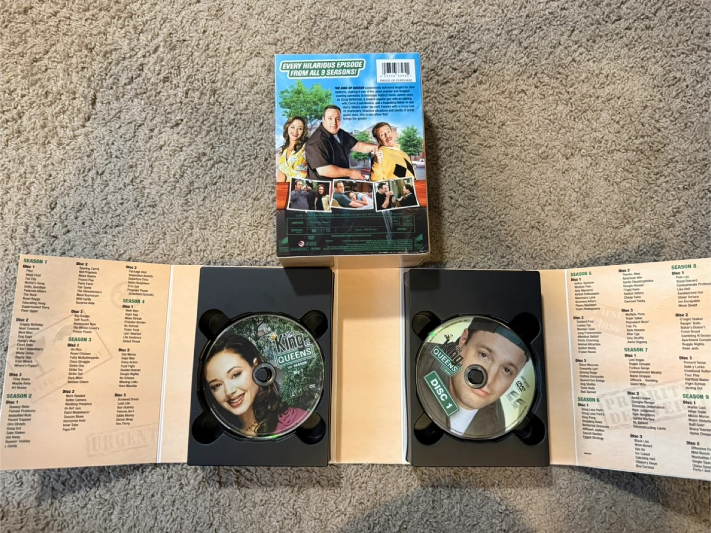 Complete 27-disc DVD set of The King of Queens, featuring all episodes from all 9 seasons. This collection includes every hilarious episode from the show's run. It's a great way to relive all the laughs and memorable moments from the beloved sitcom!