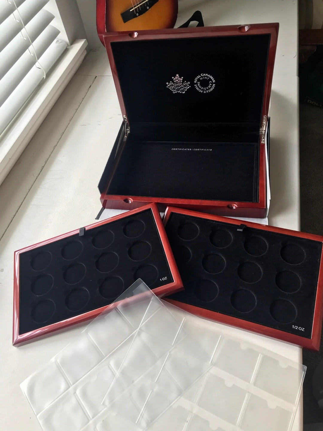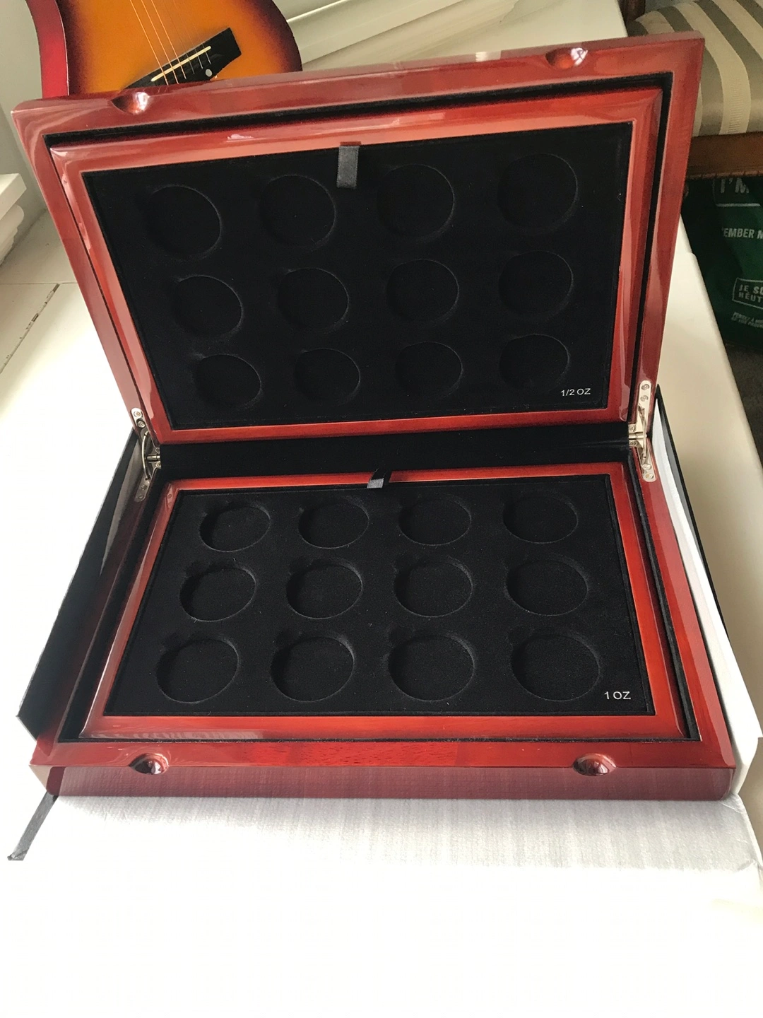 Empty wooden box set with 12 spaces for 1 oz silver coins and 12 spaces for 1/2 oz. Box is brand new.