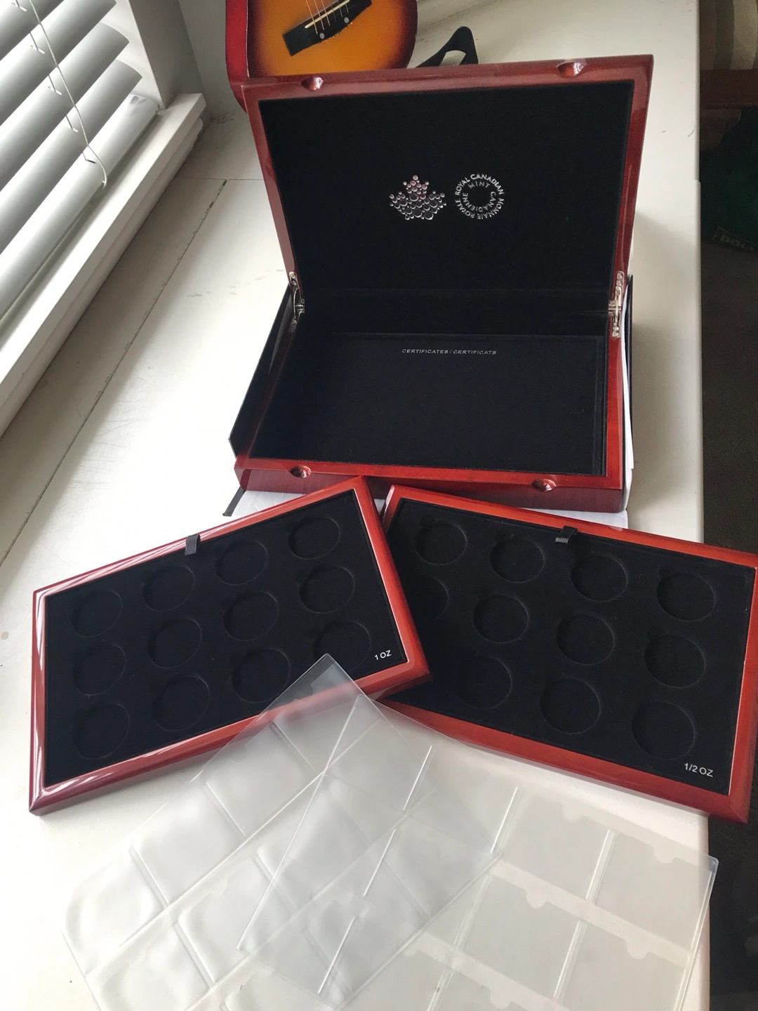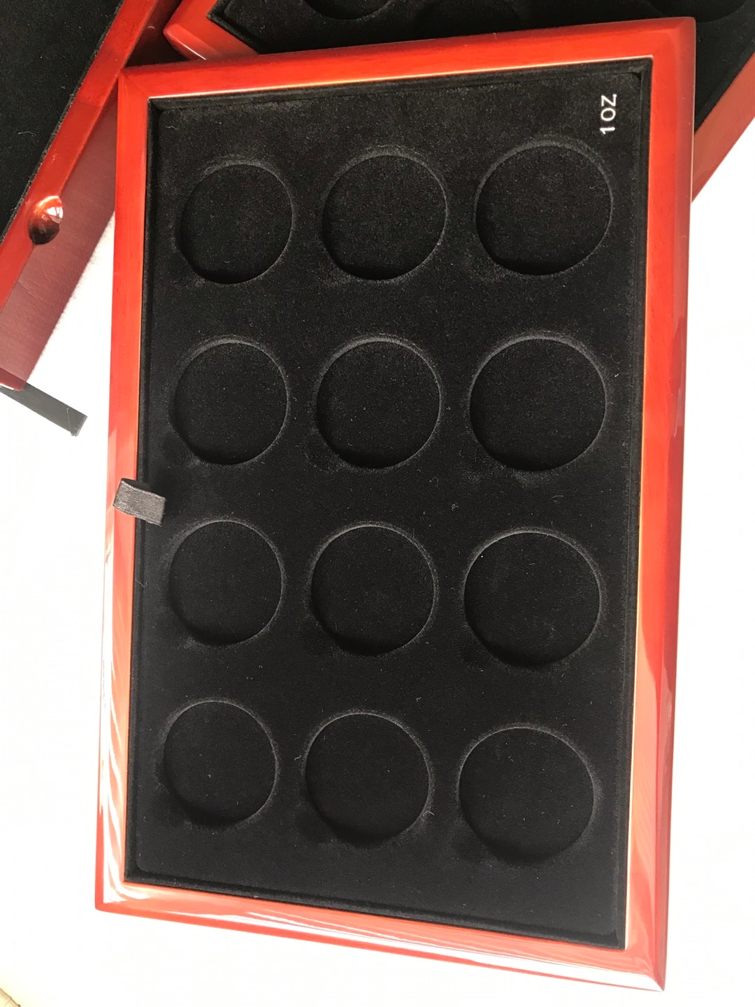 Empty wooden box set with 12 spaces for 1 oz silver coins and 12 spaces for 1/2 oz. Box is brand new.