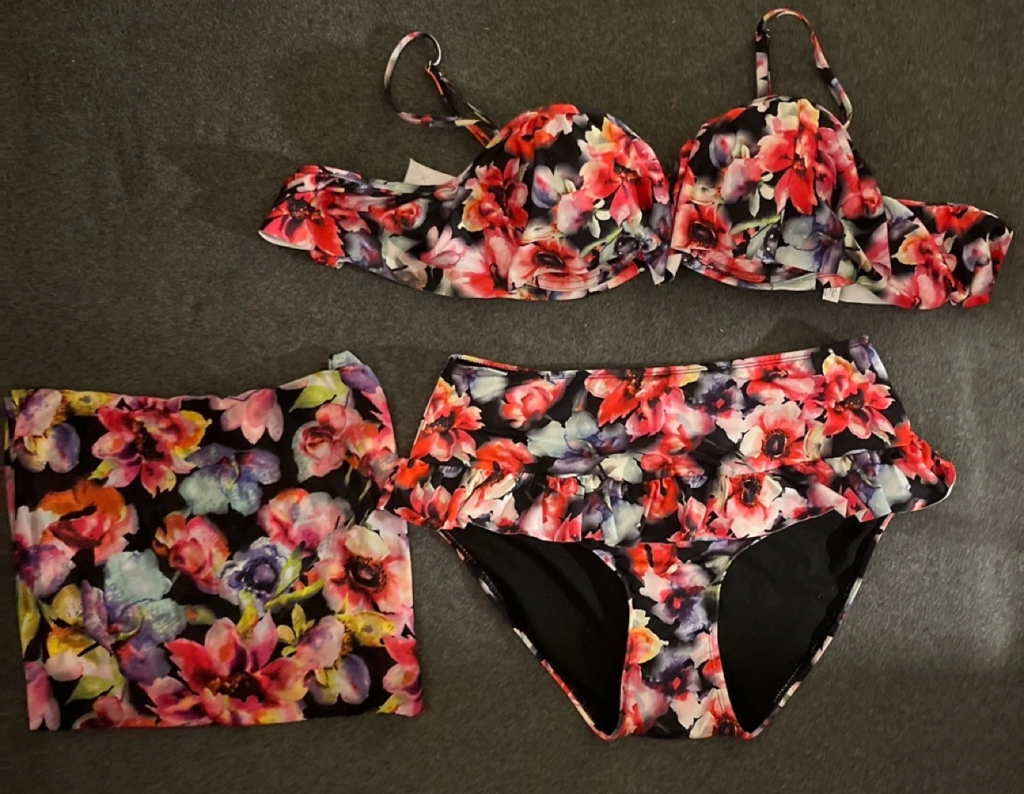 Three piece set includes a top, bottom, and a sarong.