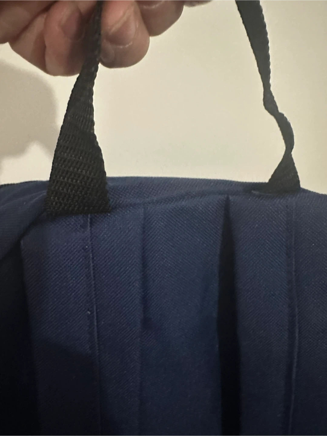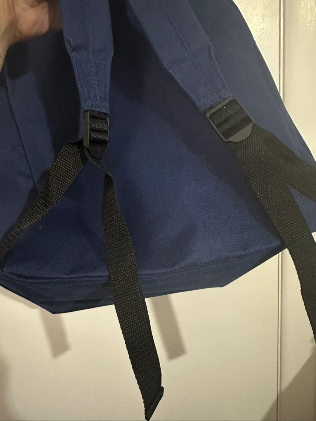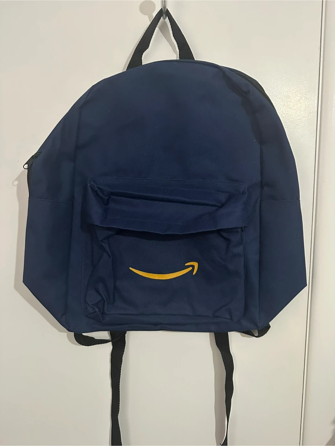This navy blue backpack features the Amazon smile logo. It has a main zippered compartment and a front pocket with a zipper closure. Durable fabric construction. New, never used. Smoke free home.