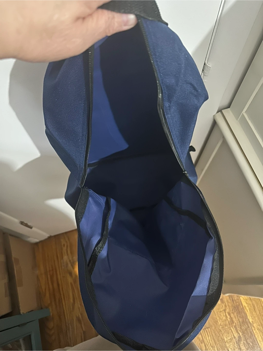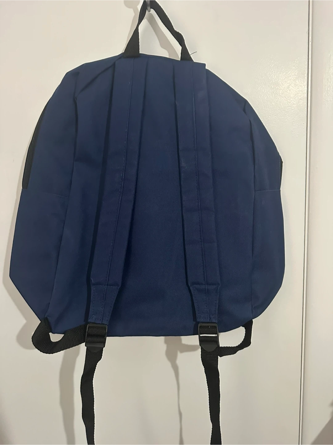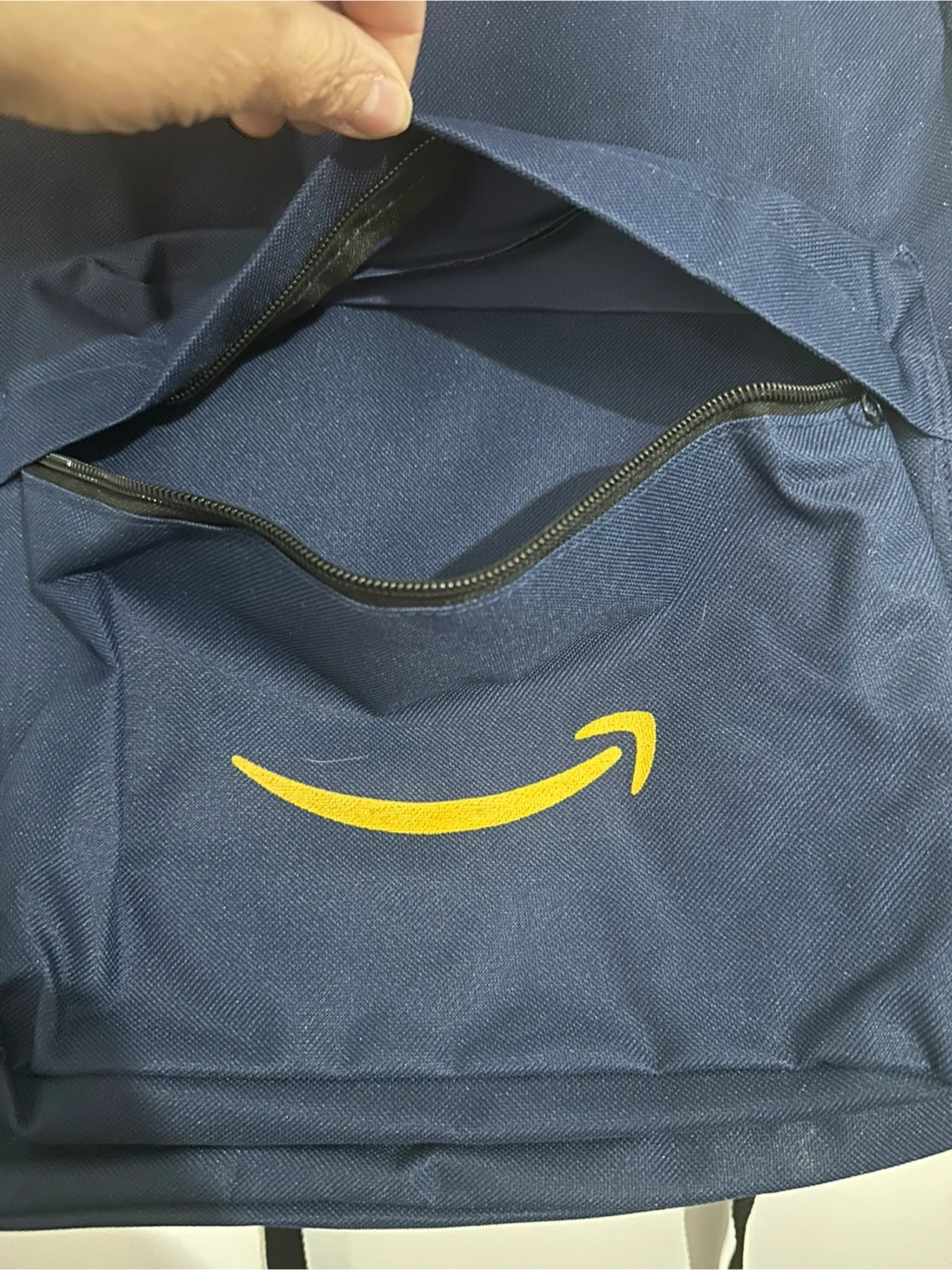 This navy blue backpack features the Amazon smile logo. It has a main zippered compartment and a front pocket with a zipper closure. Durable fabric construction. New, never used. Smoke free home.