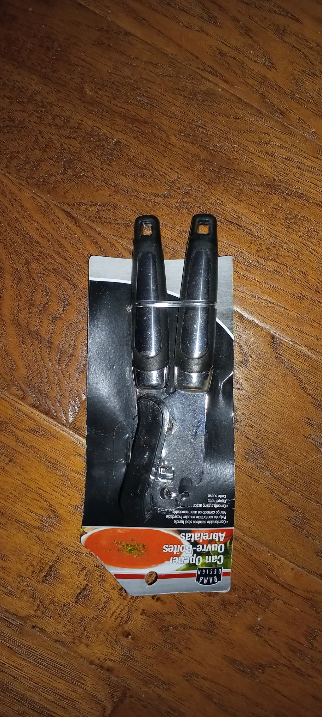 This is a new Rama Design can opener. It features a comfortable stainless steel handle and smooth cutting action. Easy to open cans with this kitchen tool!