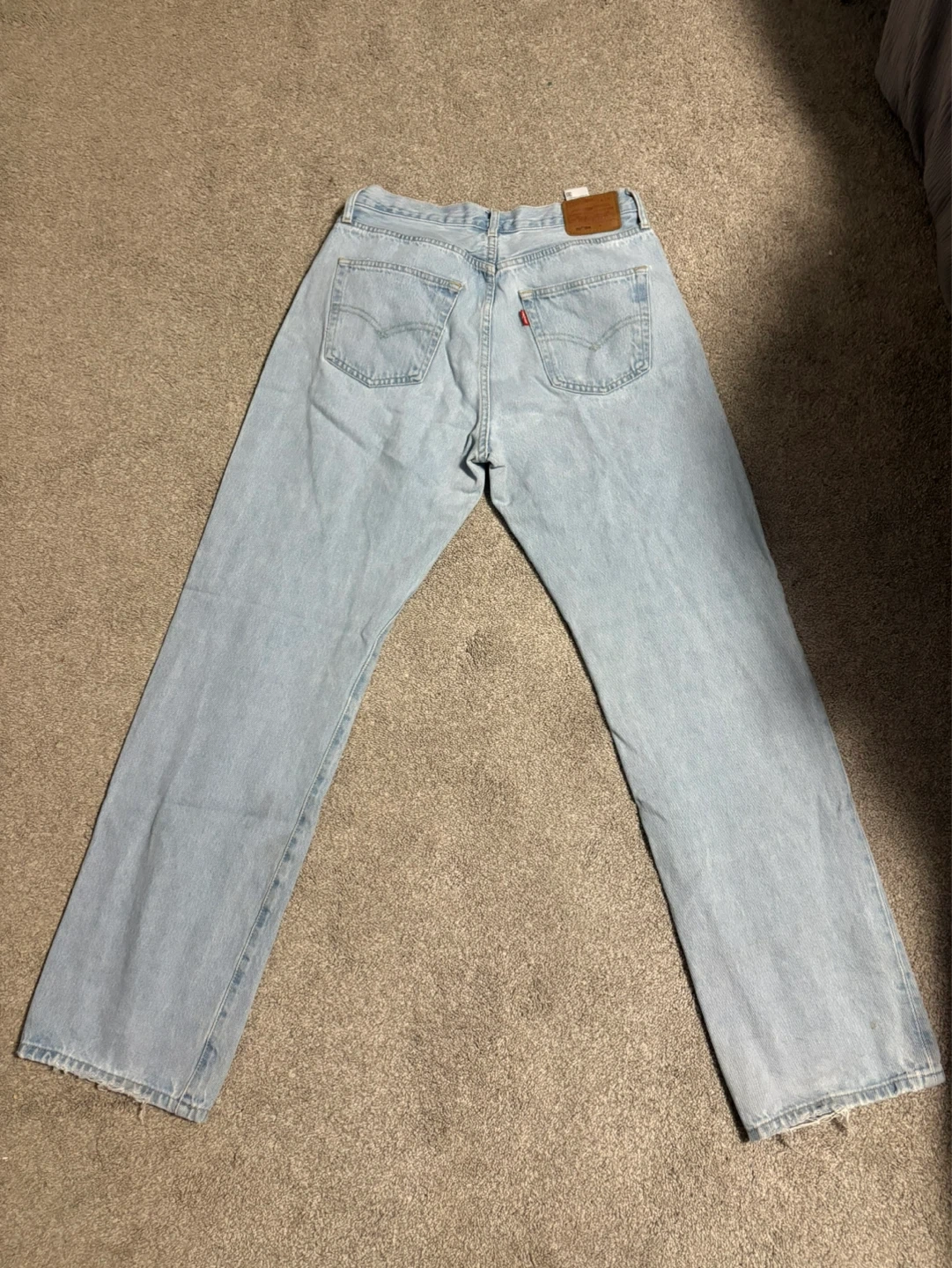 Classic Levi's 501 jeans in a light wash blue. Button fly closure. Waist is 28 inches and inseam is 32 inches.