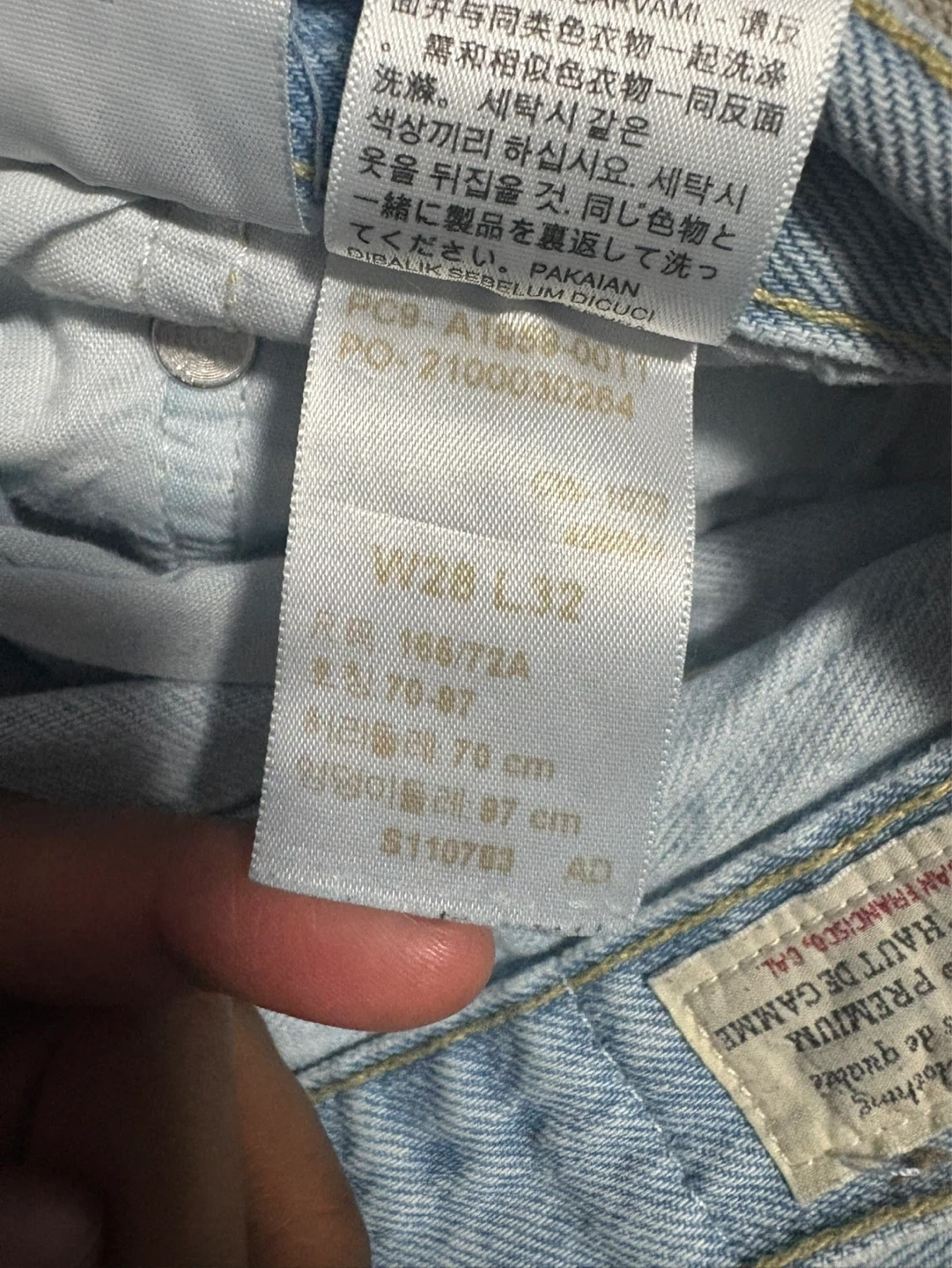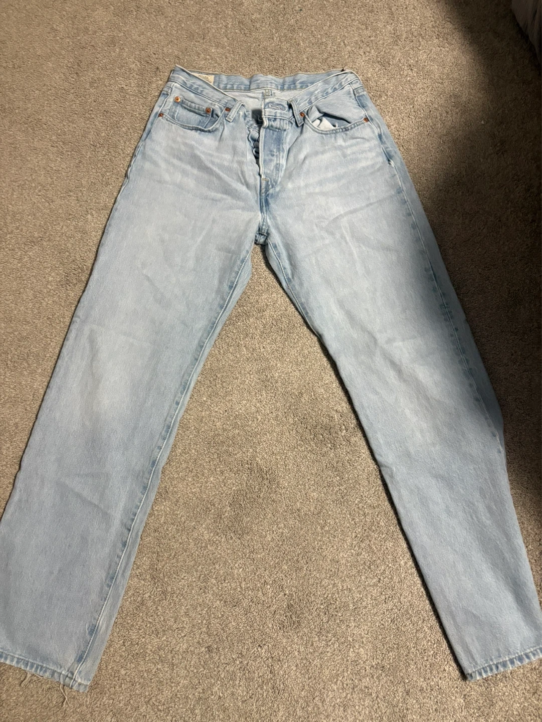 Classic Levi's 501 jeans in a light wash blue. Button fly closure. Waist is 28 inches and inseam is 32 inches.