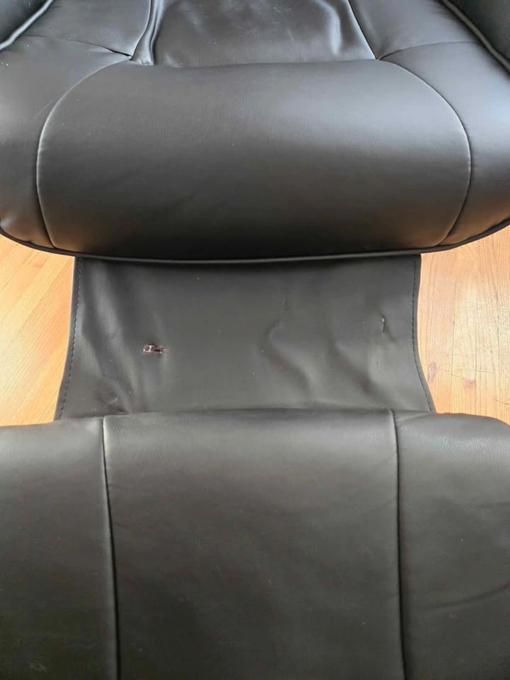 Some minor wear on the fabric panel between the seat and footrest (see photo), but it doesn’t affect use. Reclines smoothly and works well.