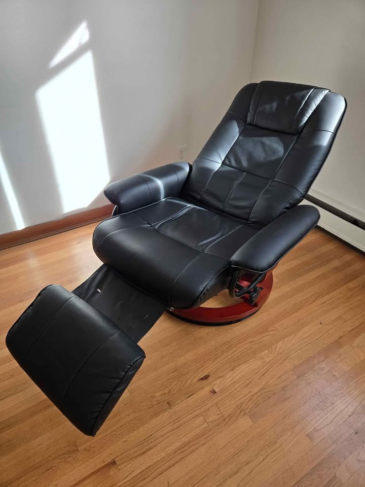 Comfortable black recliner chair with swivel wooden base and extendable footrest. Perfect as an extra seat for a living room, office, or lounge space.