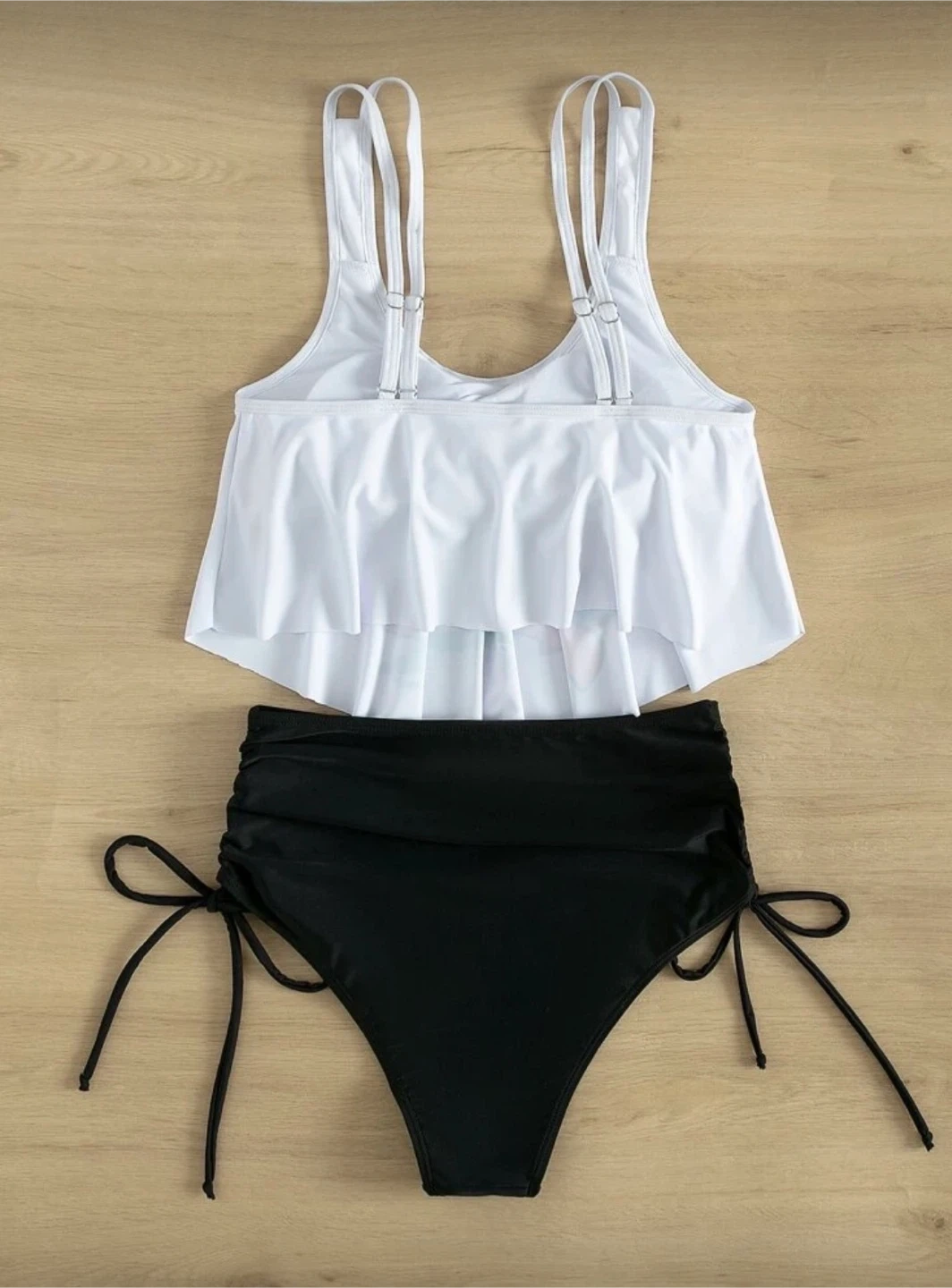 White Tankini Swimsuit with Black High-Waisted Bottoms