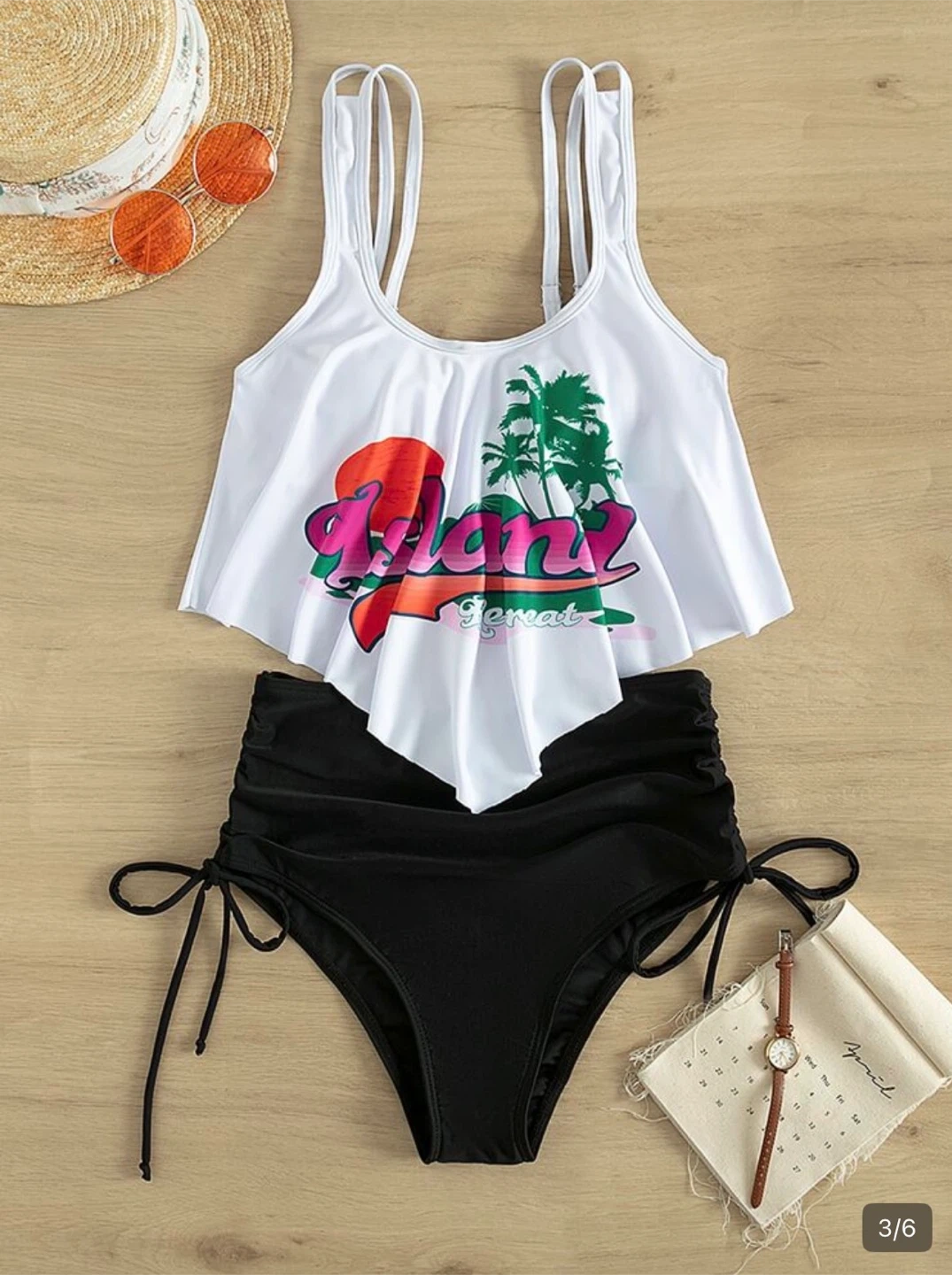 Two-piece tankini swimsuit with a ruffled white tank top featuring a colourful 'Miami' graphic. The bottom is black with a high waist and adjustable side ties. The straps on the tank top are adjustable.