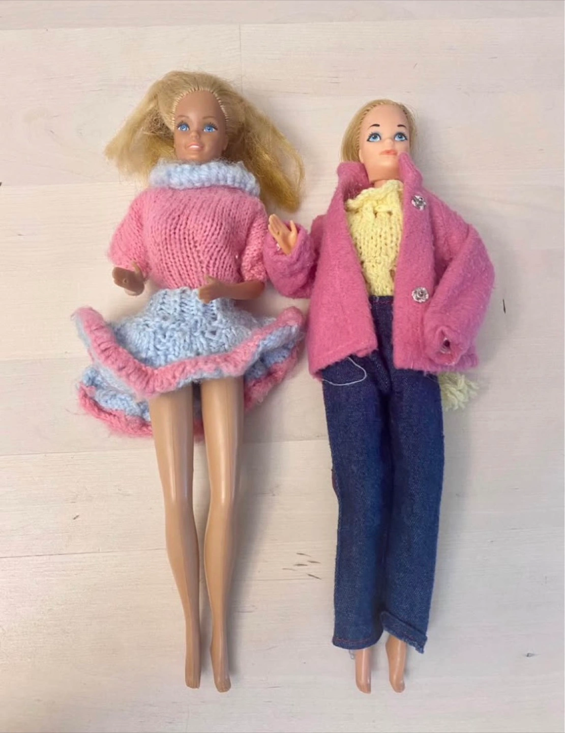 This listing includes two vintage dolls. Both have blonde hair and blue eyes and are wearing handmade knitted outfits. One doll wears a pink sweater with a light blue and pink skirt, and the other wears a yellow knitted top with a pink jacket and jeans.