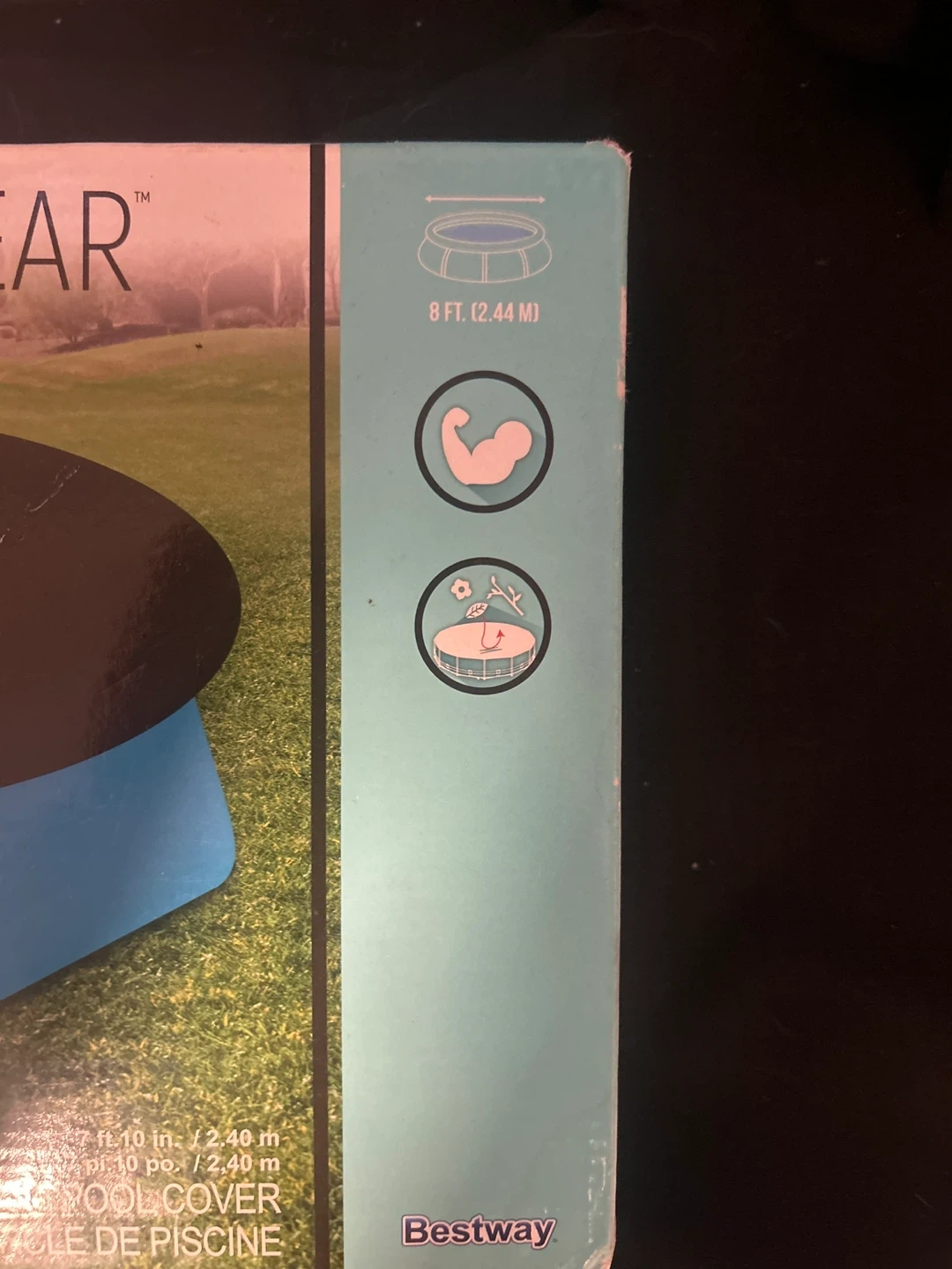 This is a Bestway Fast Set pool cover. It's designed for 8 ft pools. The cover is 7 ft 10 in, or 2.40 m. It helps keep debris out of your pool!