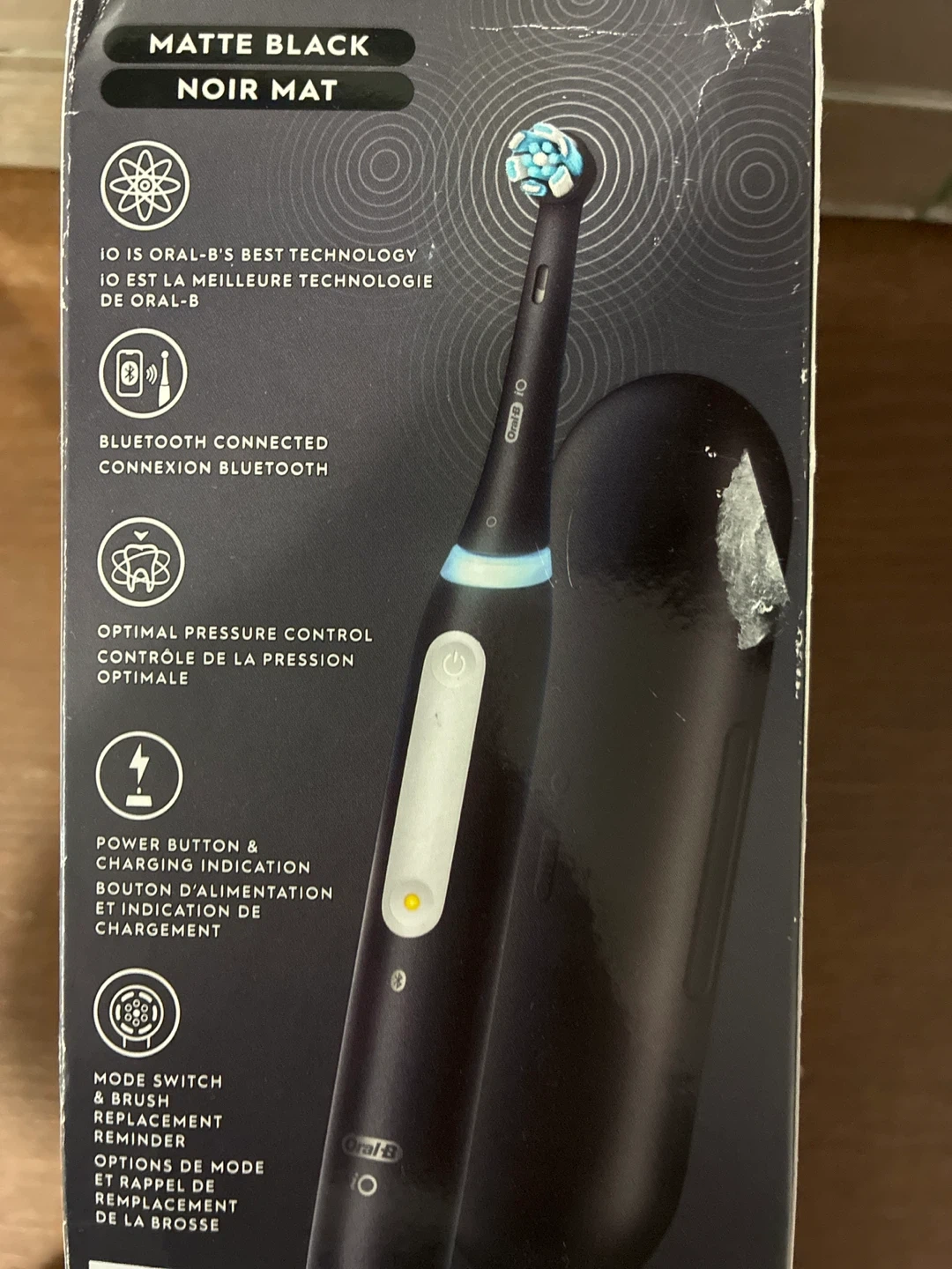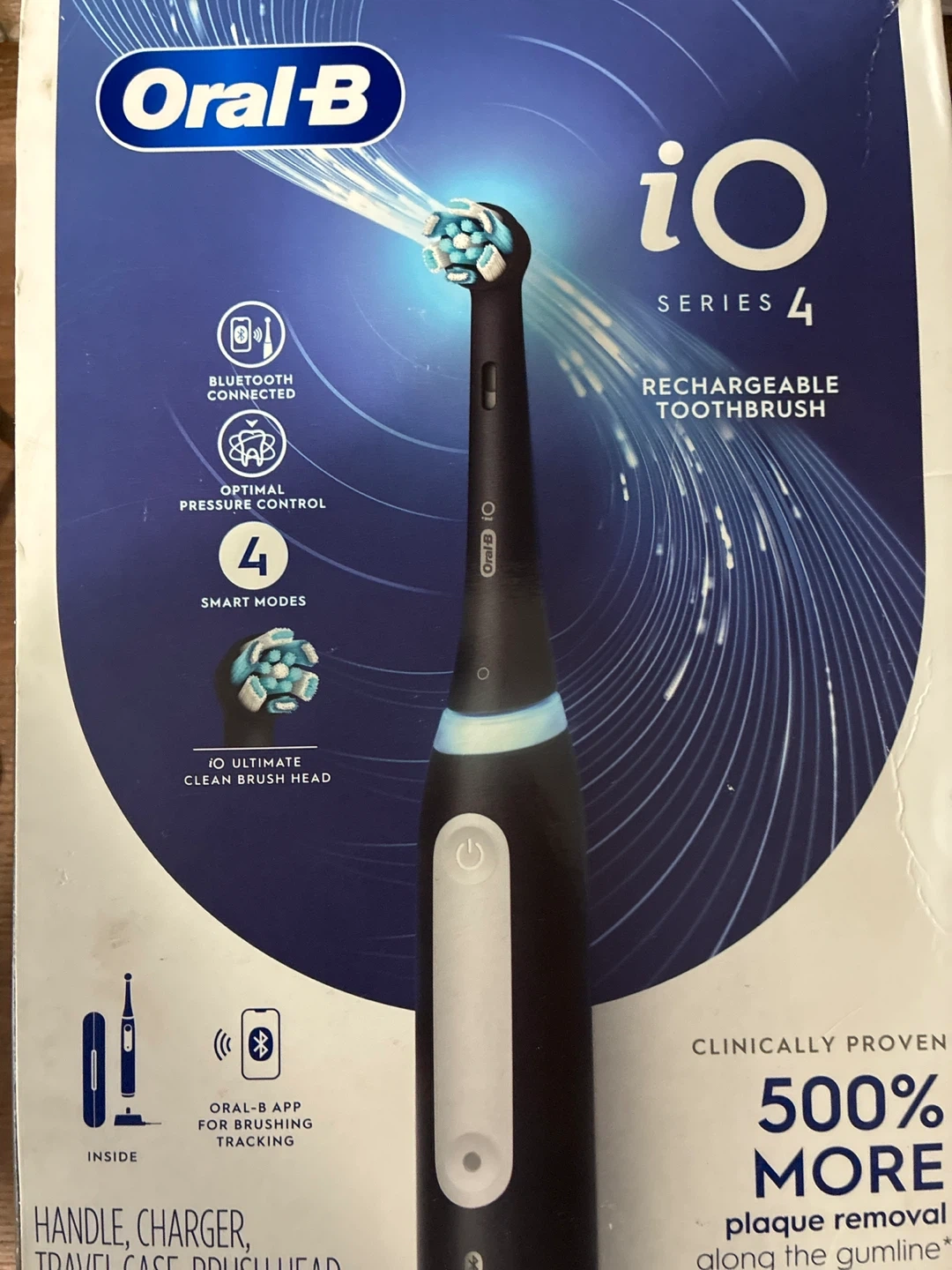 Experience revolutionary iO technology with this Oral-B rechargeable toothbrush. It features Bluetooth connectivity, optimal pressure control, and 4 smart modes: Daily Clean, Sensitive, Super Sensitive, and Whitening. This electric toothbrush comes in a sleek matte black finish and includes a handle, charger, travel case, and brush head.