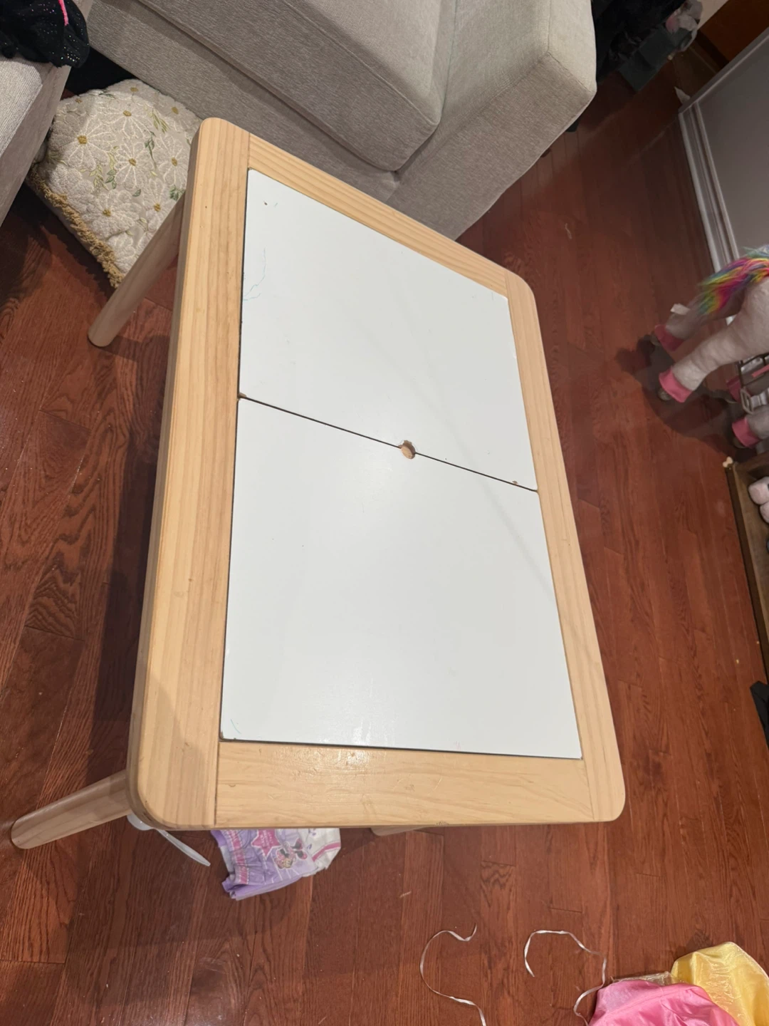 This is a kid's table with a wooden frame and a white tabletop. It's perfect for drawing or playtime. The height is suitable for young children.