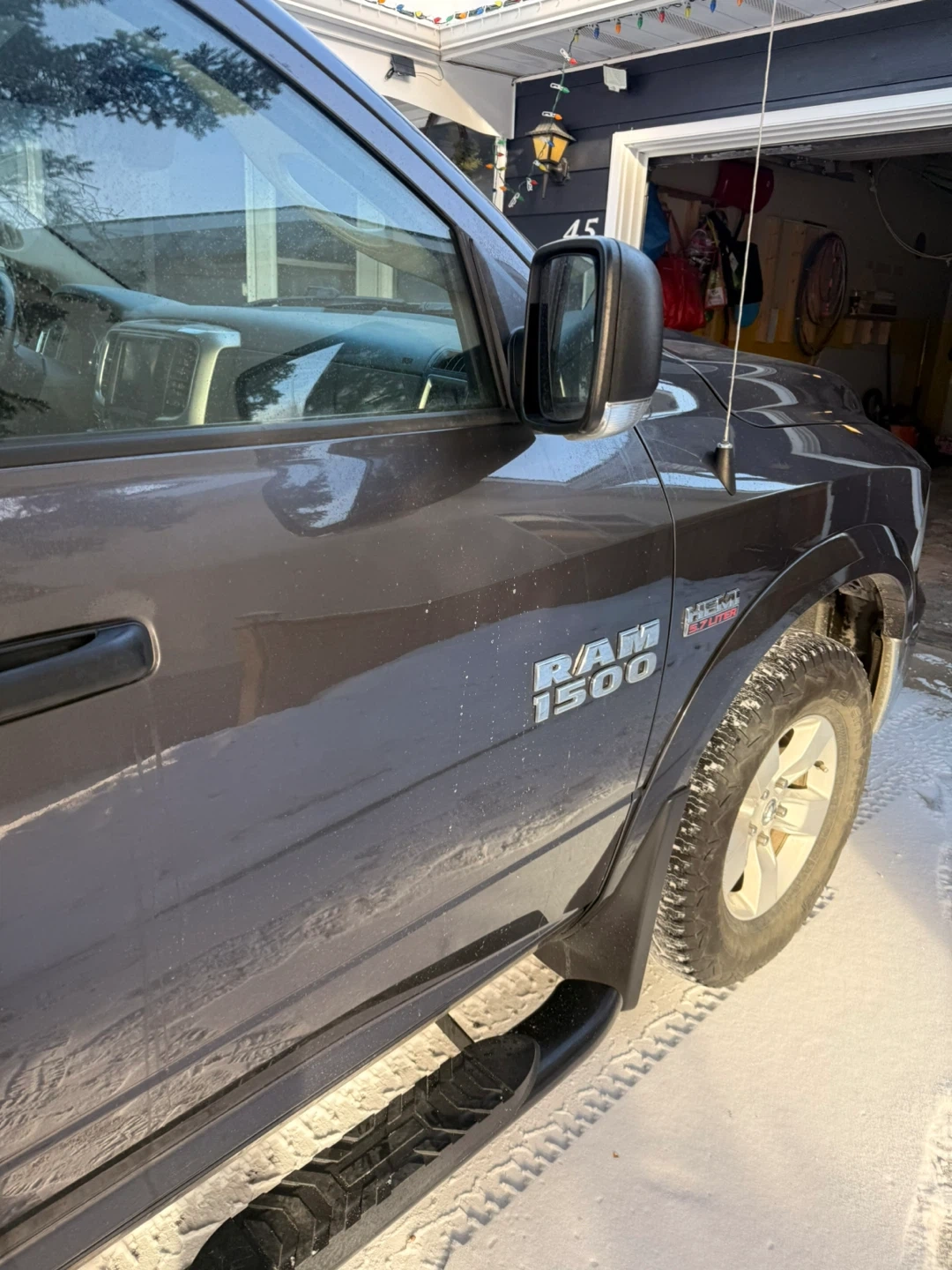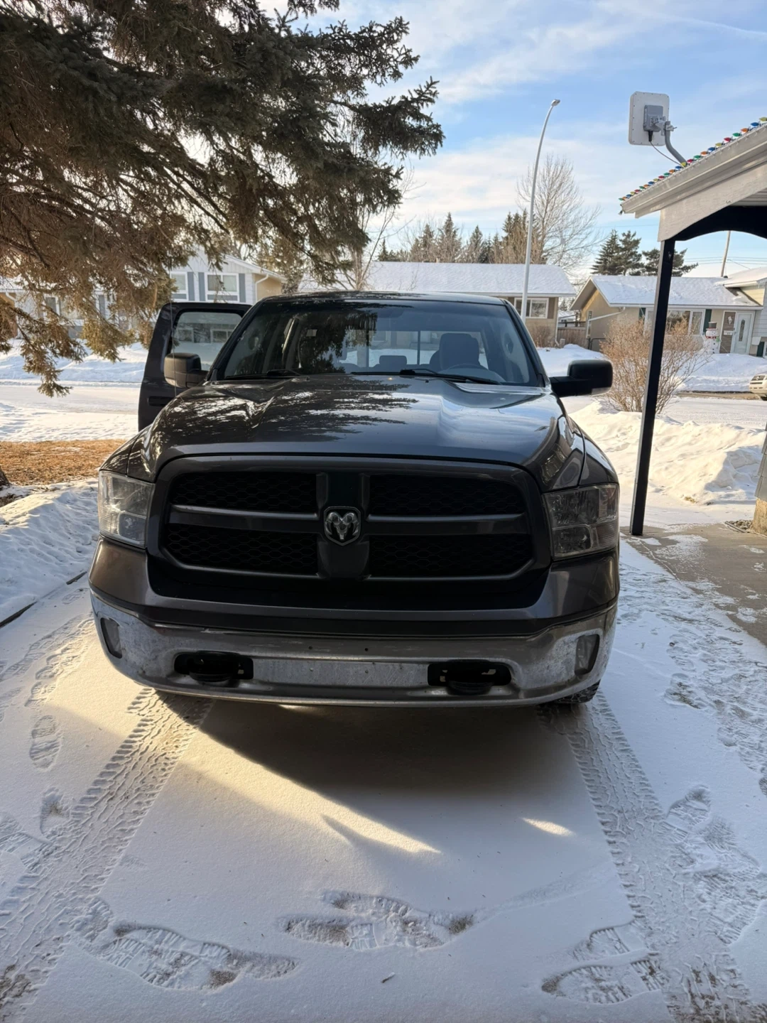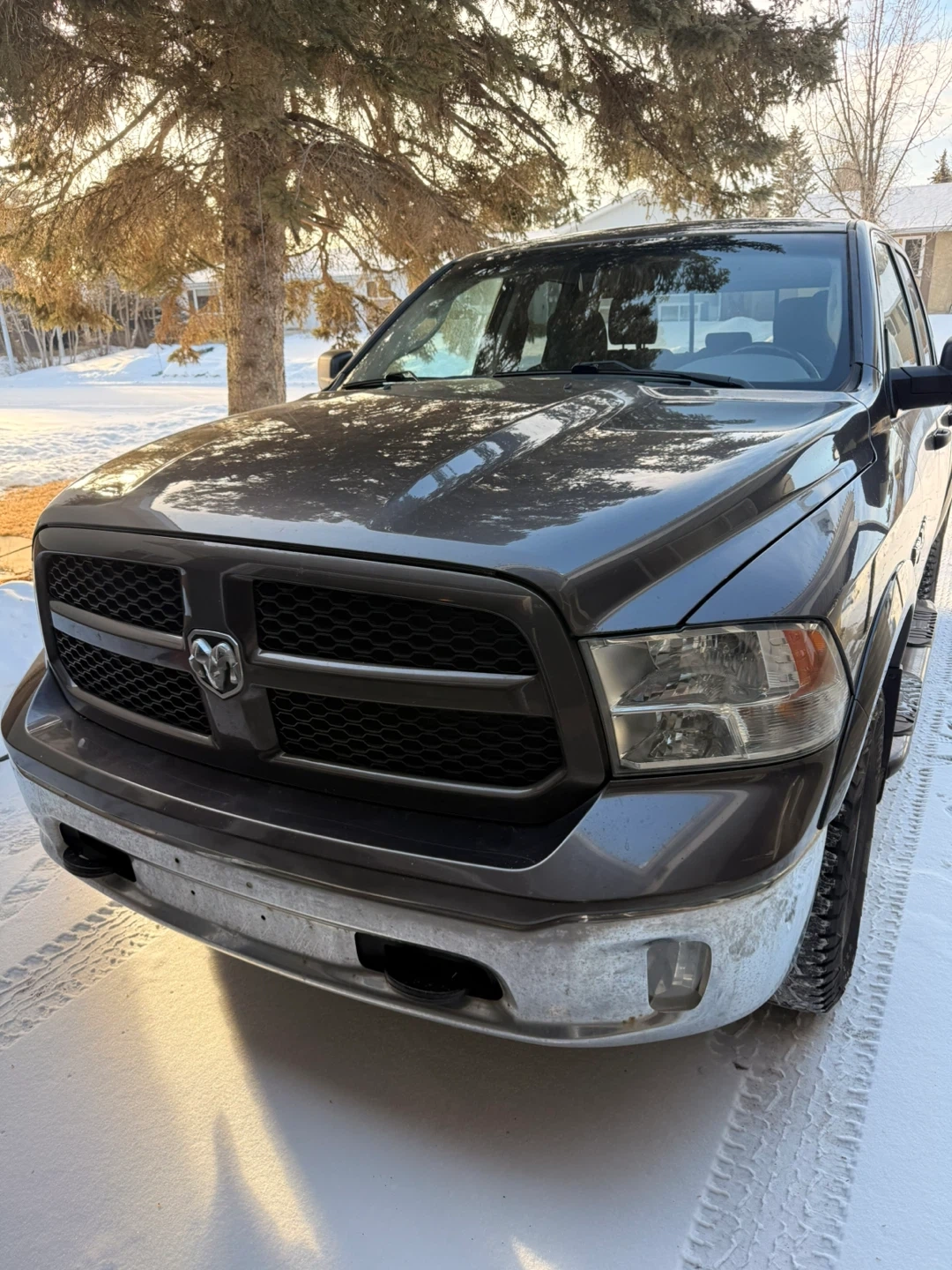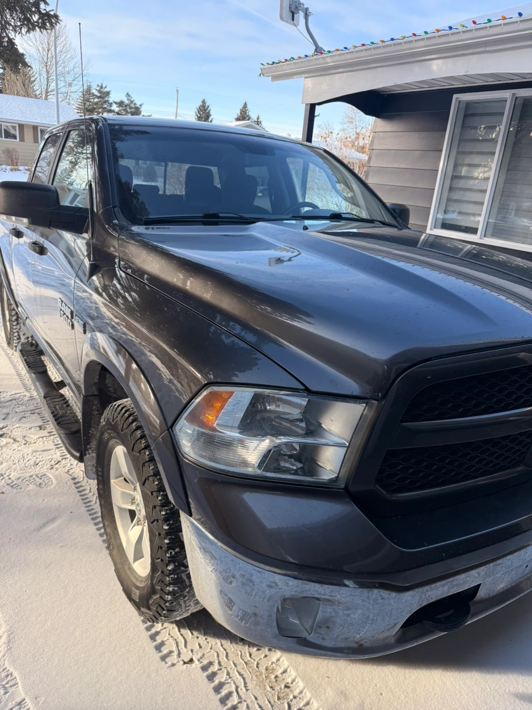 Grey Dodge Ram 1500 pickup truck with 4x4 capability. It's a crew cab model with running boards. Truck has a towing hitch. It's equipped for all seasons!
