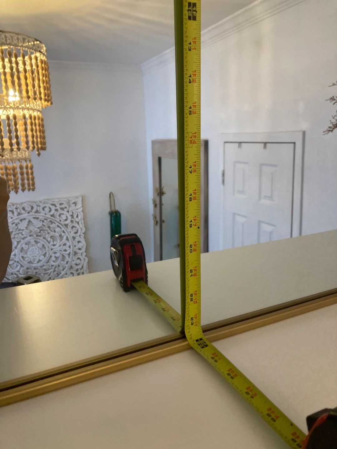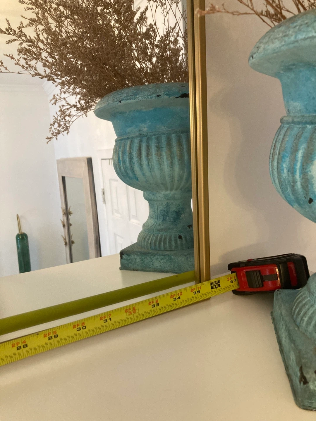 This gold arch mirror measures approximately 36 inches wide and 24 inches tall. It's perfect for adding a decorative touch to any room! The frame is made of metal.